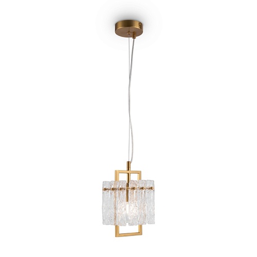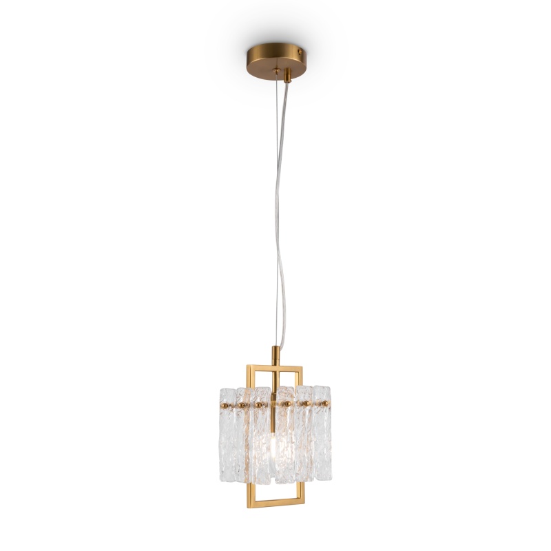 Металлическая арматура. Оттенки – латунь, никель. Декор – фактурные прямоугольные пластины. Материал декора – стекло. Подвесные светильники можно размещать на ножке и устанавливать как потолочный свет. Источник света – лампа с цоколем Е14.