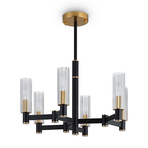 Арматура из металла сочетает два оттенка: черный и латунь. Плафоны цилиндрической формы выполнены из рельефного прозрачного стекла. Актуальная геометрия с настроением американской классики. Источник света – лампа с цоколем E14.