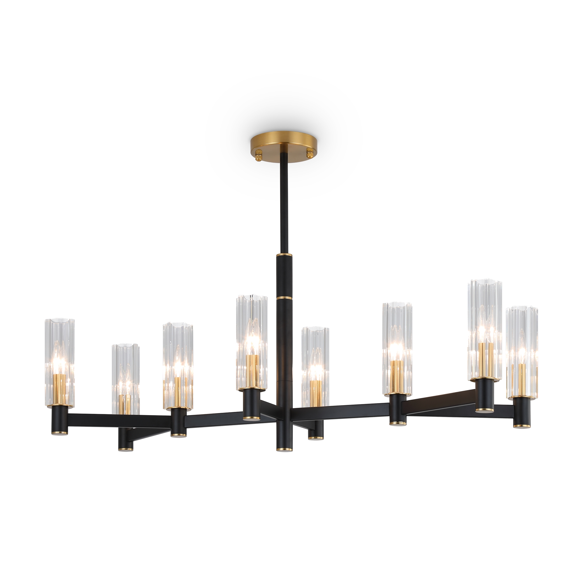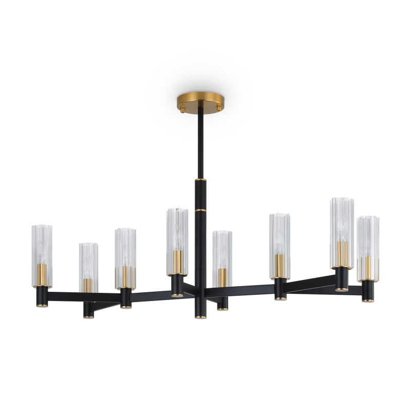 Арматура из металла сочетает два оттенка: черный и латунь. Плафоны цилиндрической формы выполнены из рельефного прозрачного стекла. Актуальная геометрия с настроением американской классики. Источник света – лампа с цоколем E14.
