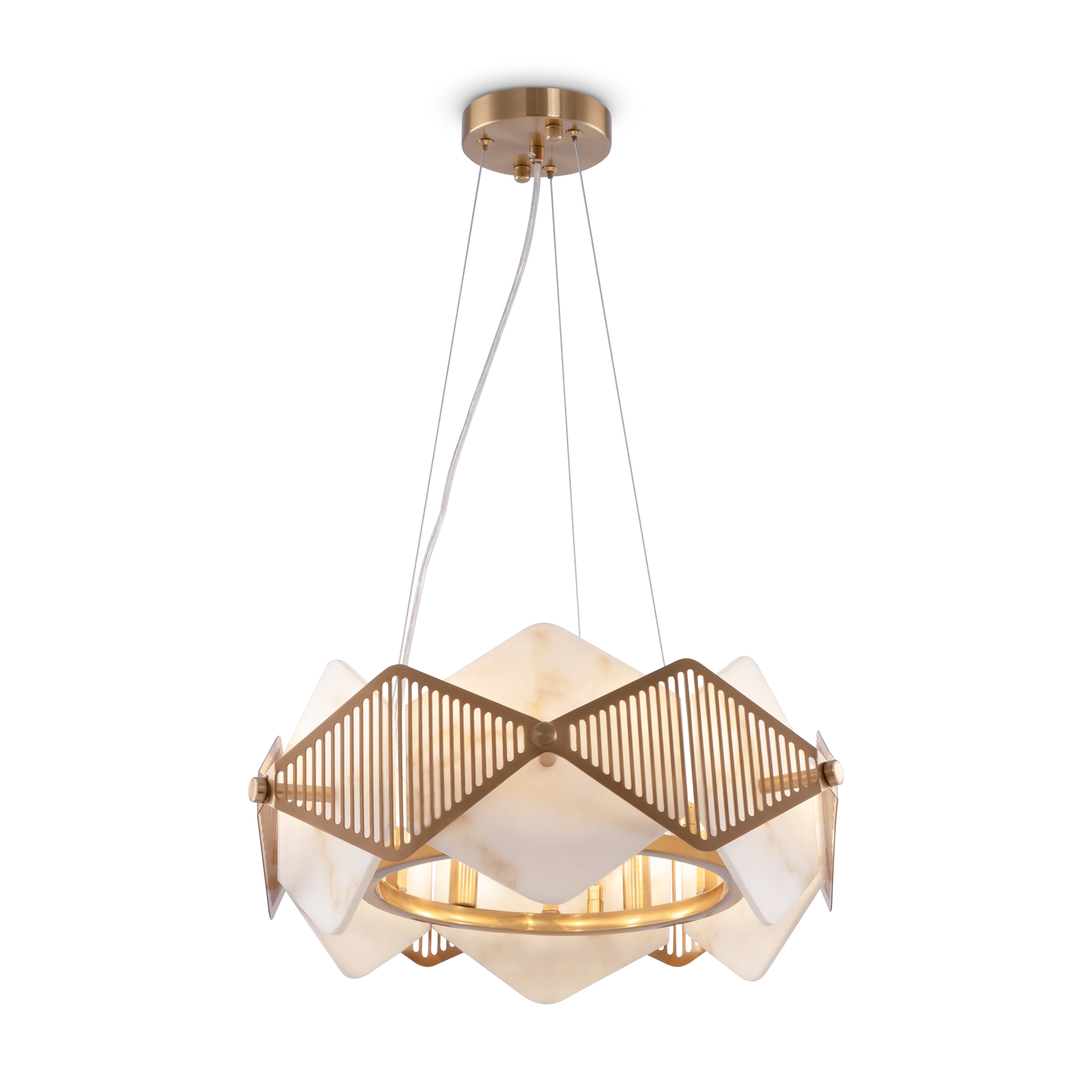 Металлическая арматура. Оттенок – латунь. Трендовый контраст фактур в декоре: пластины с текстурой каррарского мрамора дополнены решетчатыми металлическими ромбами. Источник света – лампа G9.