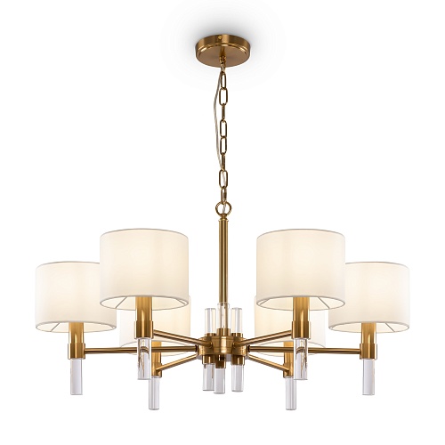 Металлическая арматура. Цвет – латунь. Тканевые абажуры белого оттенка. Декор – прозрачные акриловые трубки. Трендовая комбинация фактур и материалов. Широкий ассортимент. Торшер и подвес с цоколем Е27, лампа, бра и люстры – Е14.