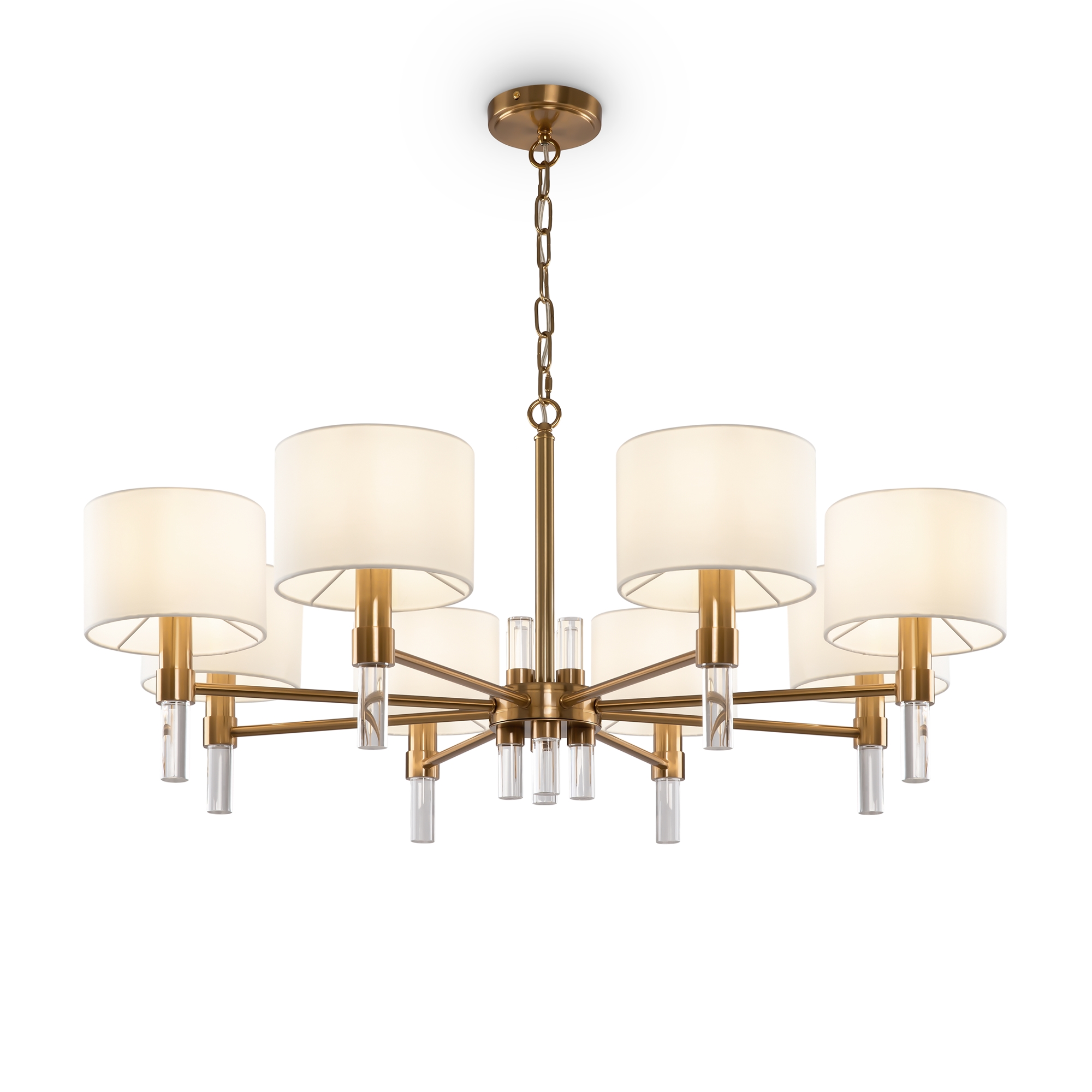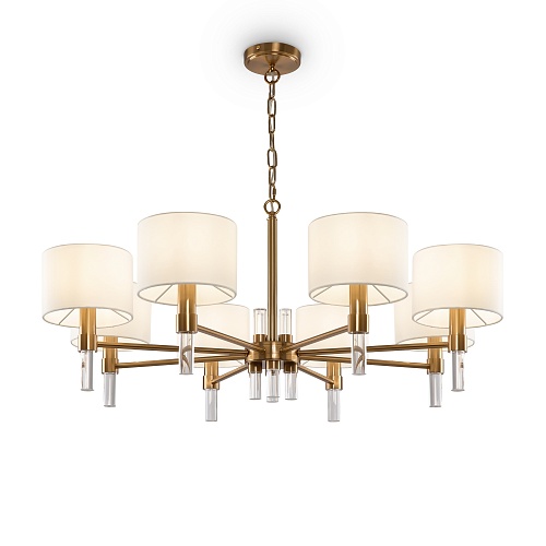 Металлическая арматура. Цвет – латунь. Тканевые абажуры белого оттенка. Декор – прозрачные акриловые трубки. Трендовая комбинация фактур и материалов. Широкий ассортимент. Торшер и подвес с цоколем Е27, лампа, бра и люстры – Е14.