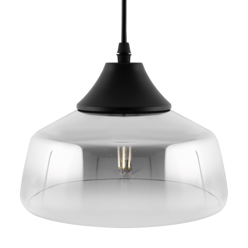 Металлическая арматура в черном цвете. Стеклянный плафон с мягким градиентным переходом оттенков. Цветовые решения – серый, янтарный. Трендовая обтекаемая форма. Источник света – лампа с цоколем E27.