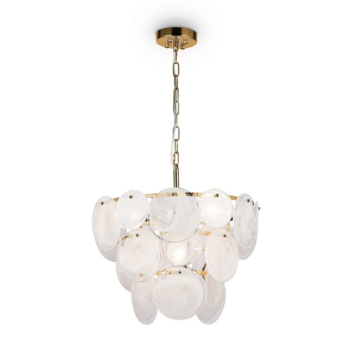 Металлическая арматура. Оттенки – латунь, хром. Оригинальный разноразмерный декор с эффектом замороженной фактуры. Материал декора – стекло. В качестве источников света используются лампы с цоколем Е14.