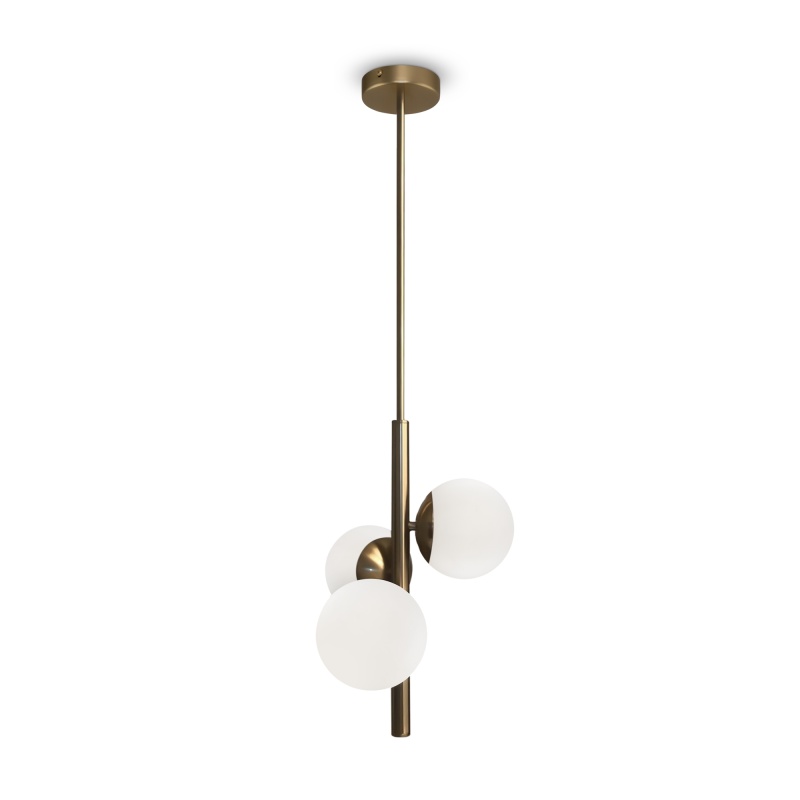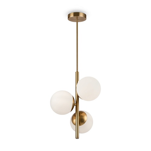 Металлическая арматура. Оттенок – латунь. Плафоны-сферы из матового стекла. Оригинальное конструктивное решение: плафоны размещены на горизонтальной или вертикальной планке. Источник света – лампа с цоколем Е27.