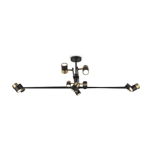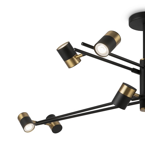 Арматура и плафоны из металла. Черный цвет дополнен латунной окантовкой. Поворотные плафоны и арматура позволяют видоизменять композицию и регулировать направление светового потока. Источник света – лампа GU10.
