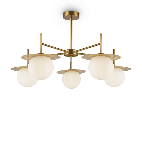 Арматура из металла, цвет – латунь. Плафоны сферической формы из матового белого стекла. Плоские розетки с эффектом чеканки. Трендовый микс фактур. Источник света – лампа с цоколем Е27.