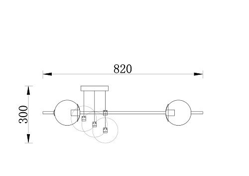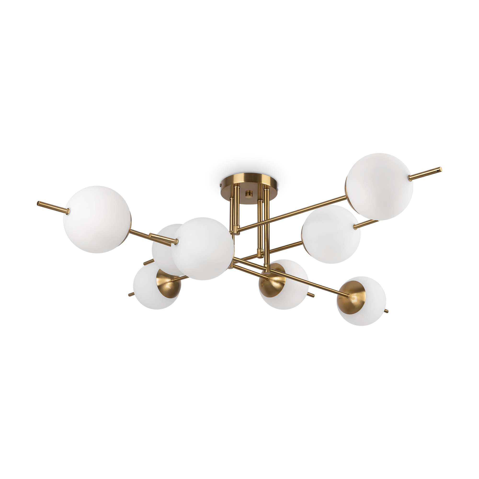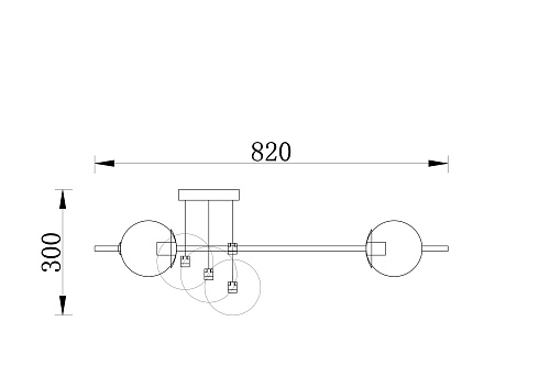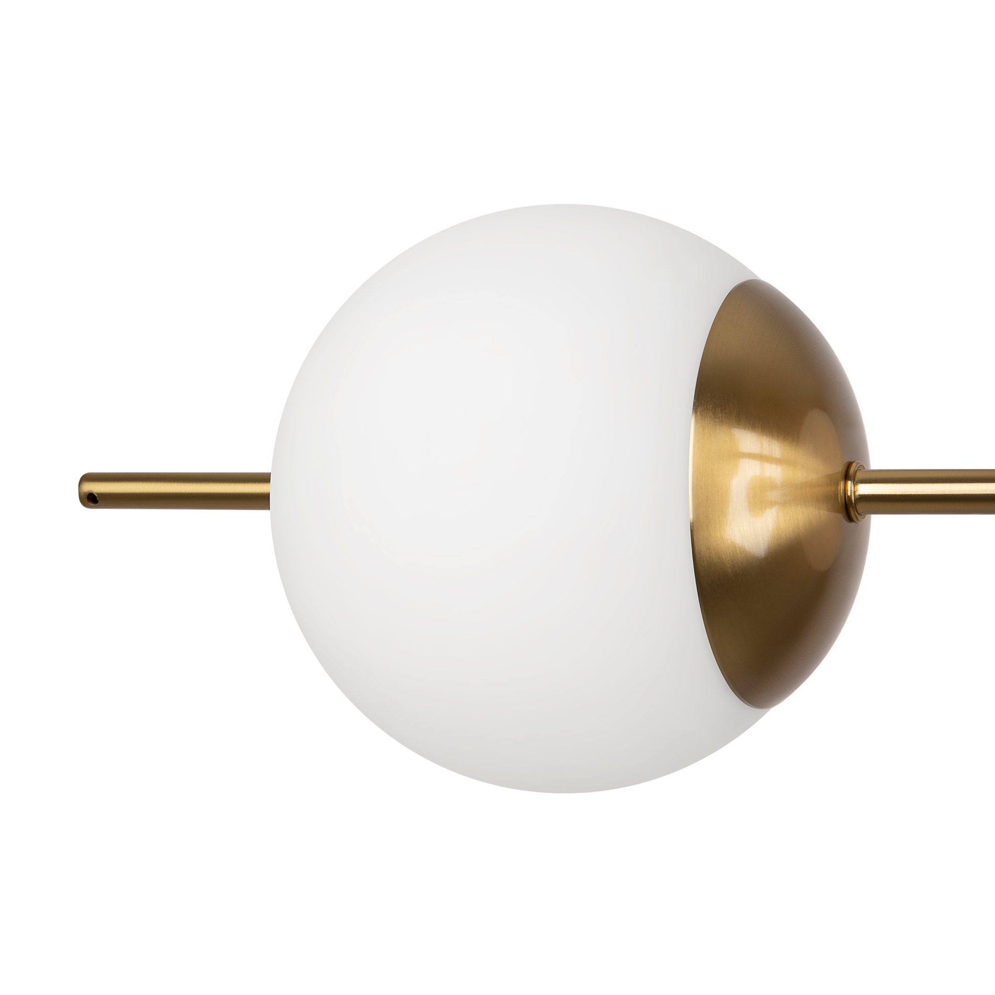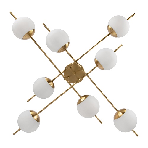 Арматура из металла. Цвет – латунь. Плафоны – матовое белое стекло. Трендовая геометрия в дизайне: арматура «пронизывает» плафоны-сферы. Источник света – лампа с цоколем Е27.