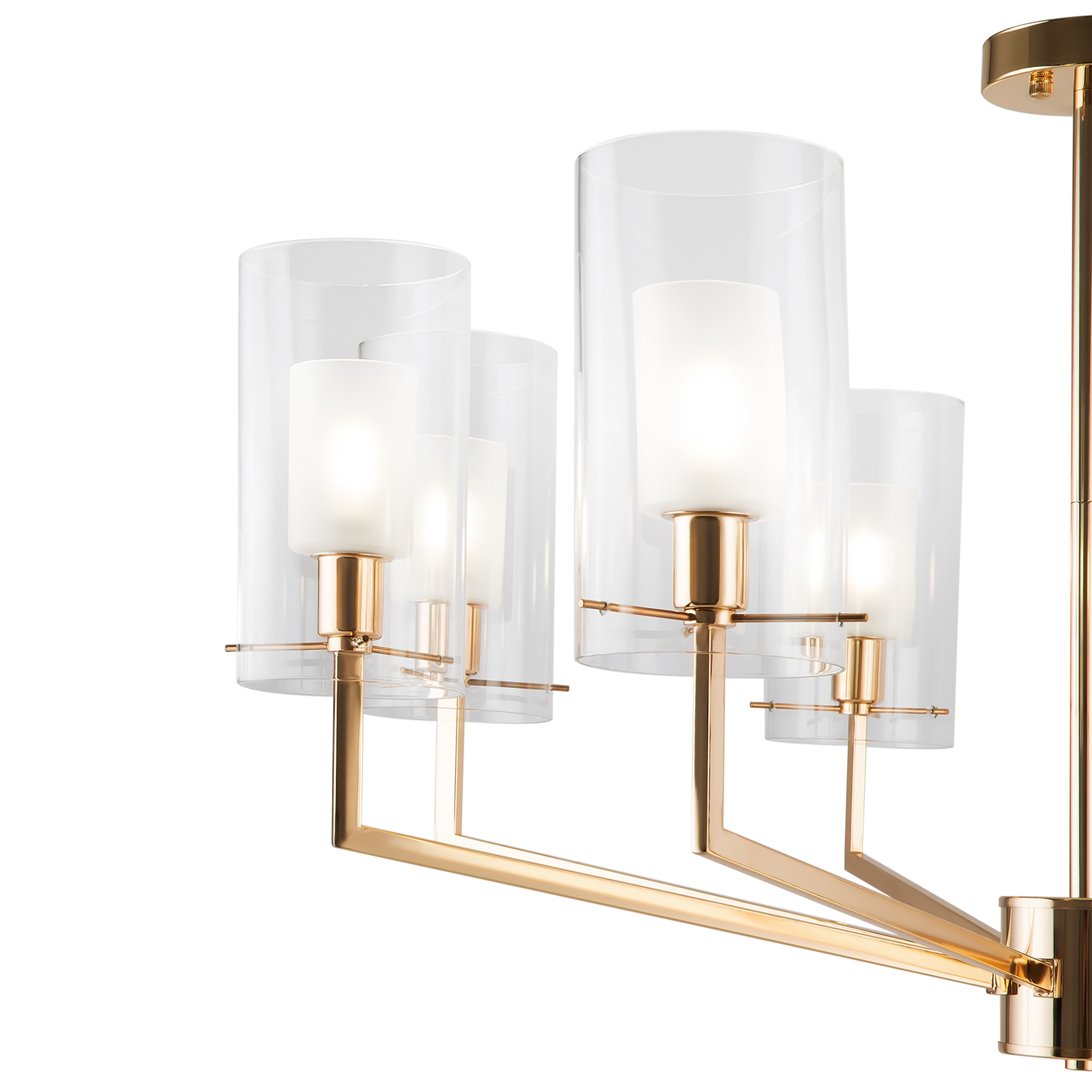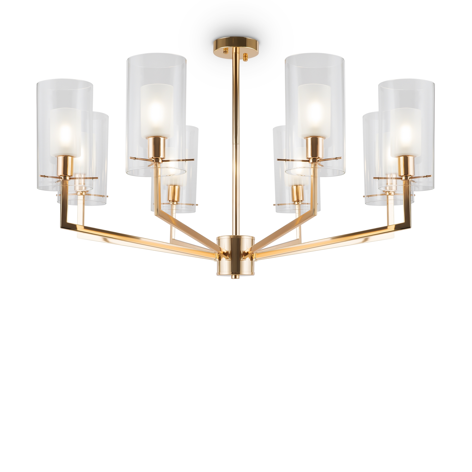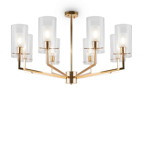 Металлическая арматура оттенка французского золота. Двойные стеклянные плафоны: матовые внутри, прозрачные снаружи. Лаконичная геометрия с симметричным расположением элементов. Источник света – лампа с цоколем E14.