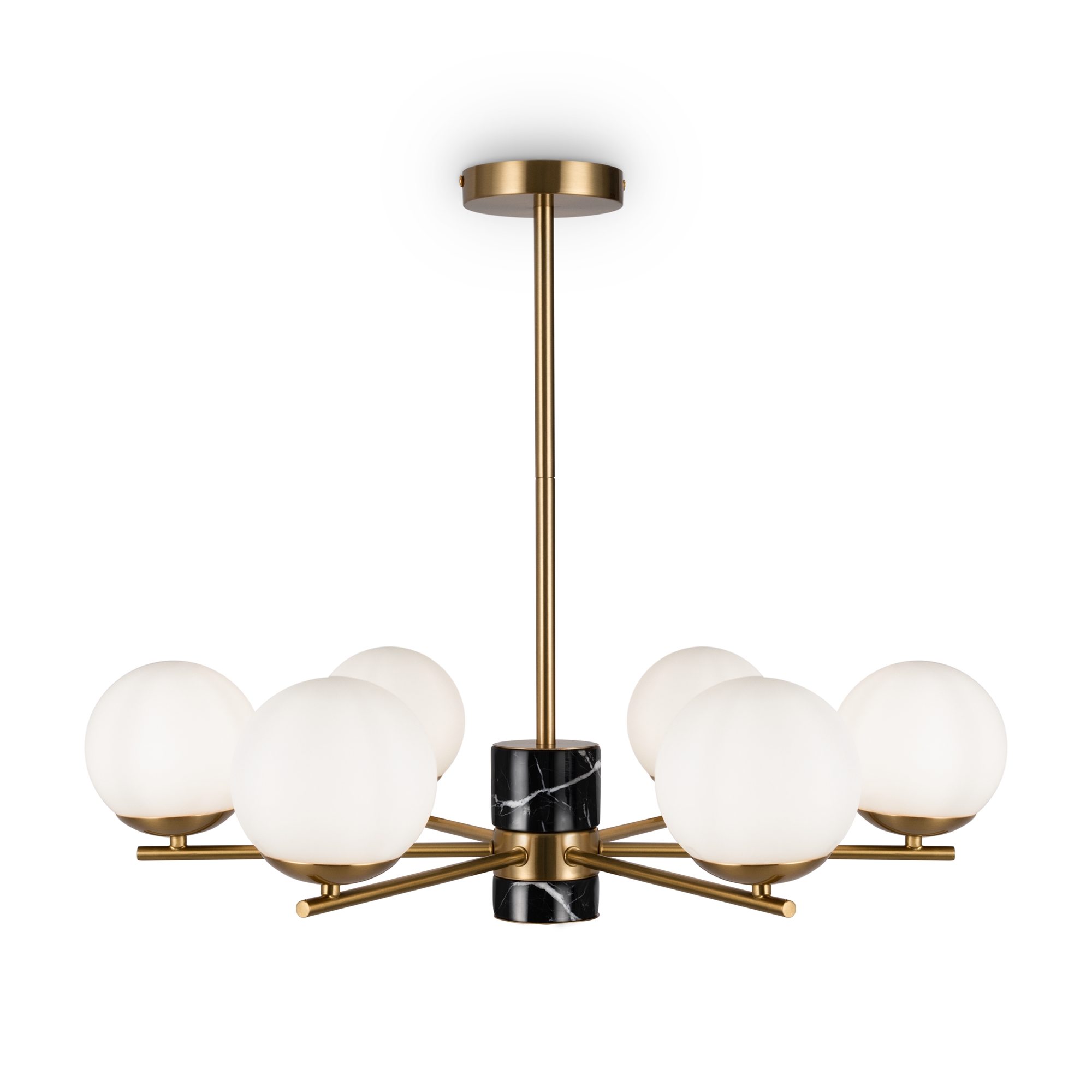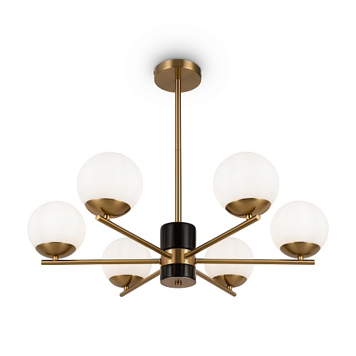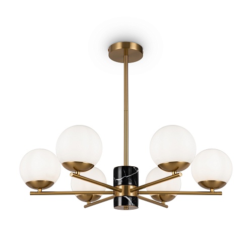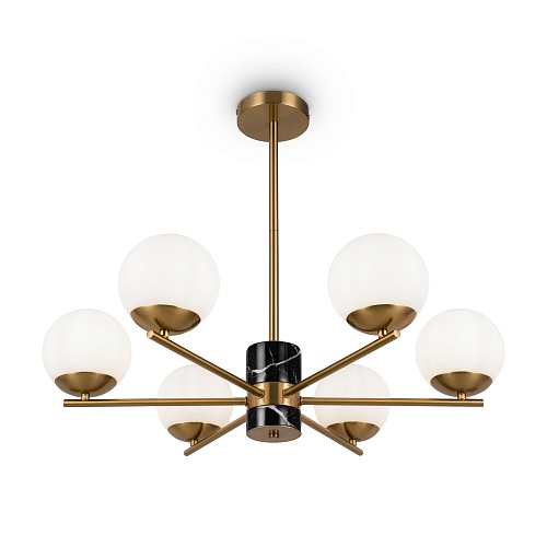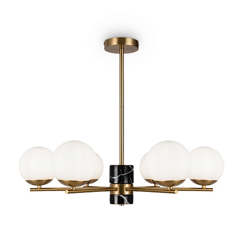 Арматура - металл, цвет - латунь. Мраморные черные элементы в основании. Плафоны-сферы из белого матового стекла с металлической апликацией у основания крепления в цвет арматуры. Сменямый источник света - лампы с цоколем Е27.