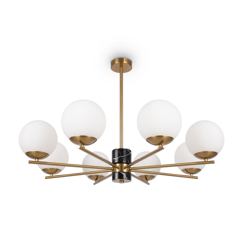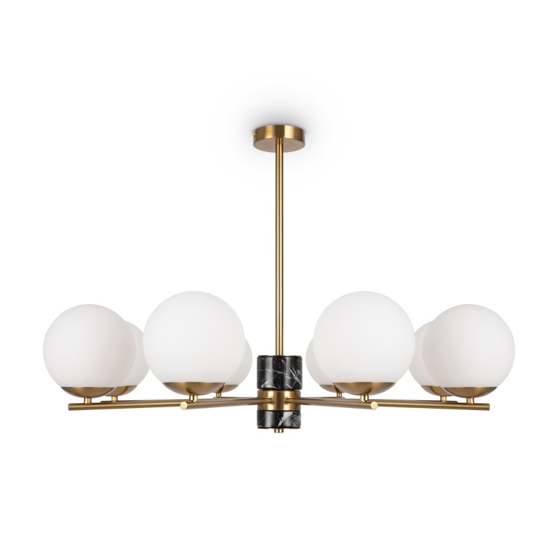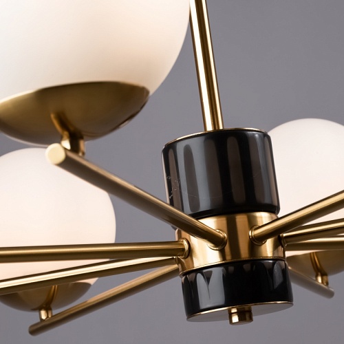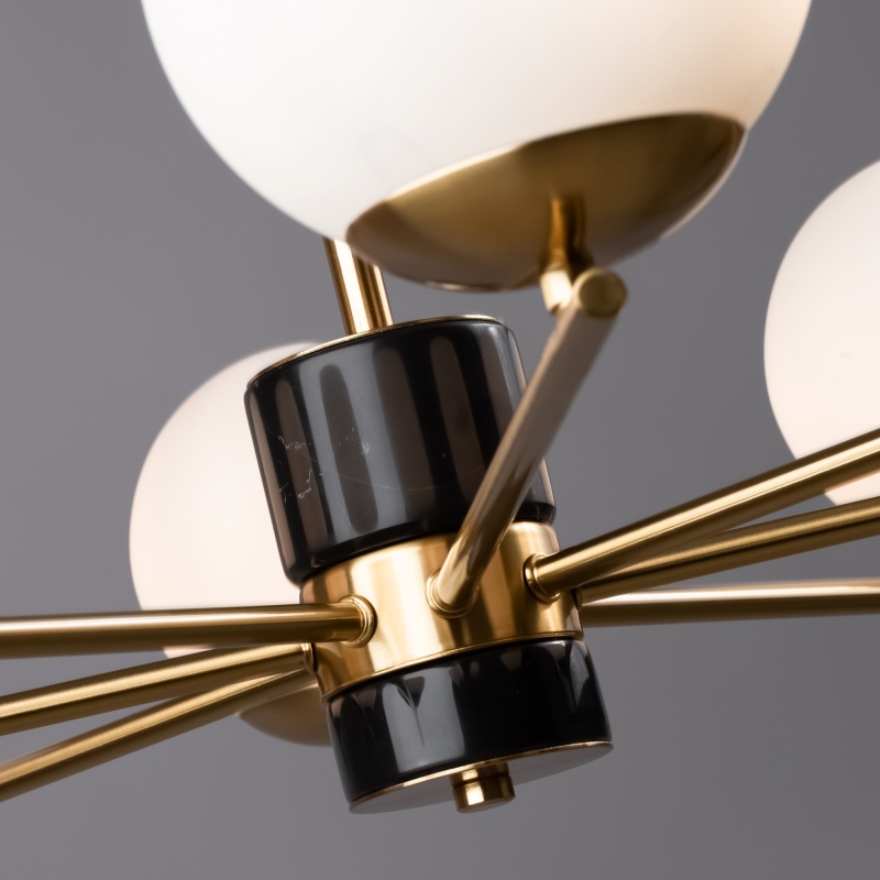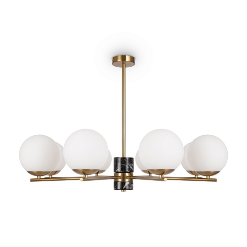 Арматура - металл, цвет - латунь. Мраморные черные элементы в основании. Плафоны-сферы из белого матового стекла с металлической апликацией у основания крепления в цвет арматуры. Сменямый источник света - лампы с цоколем Е27.