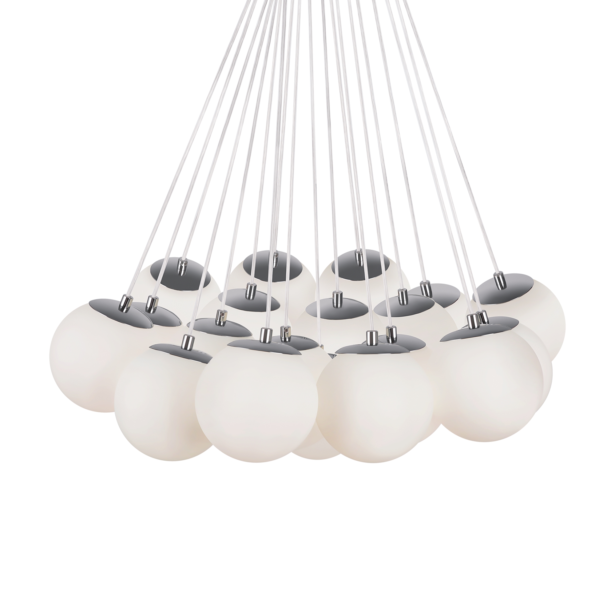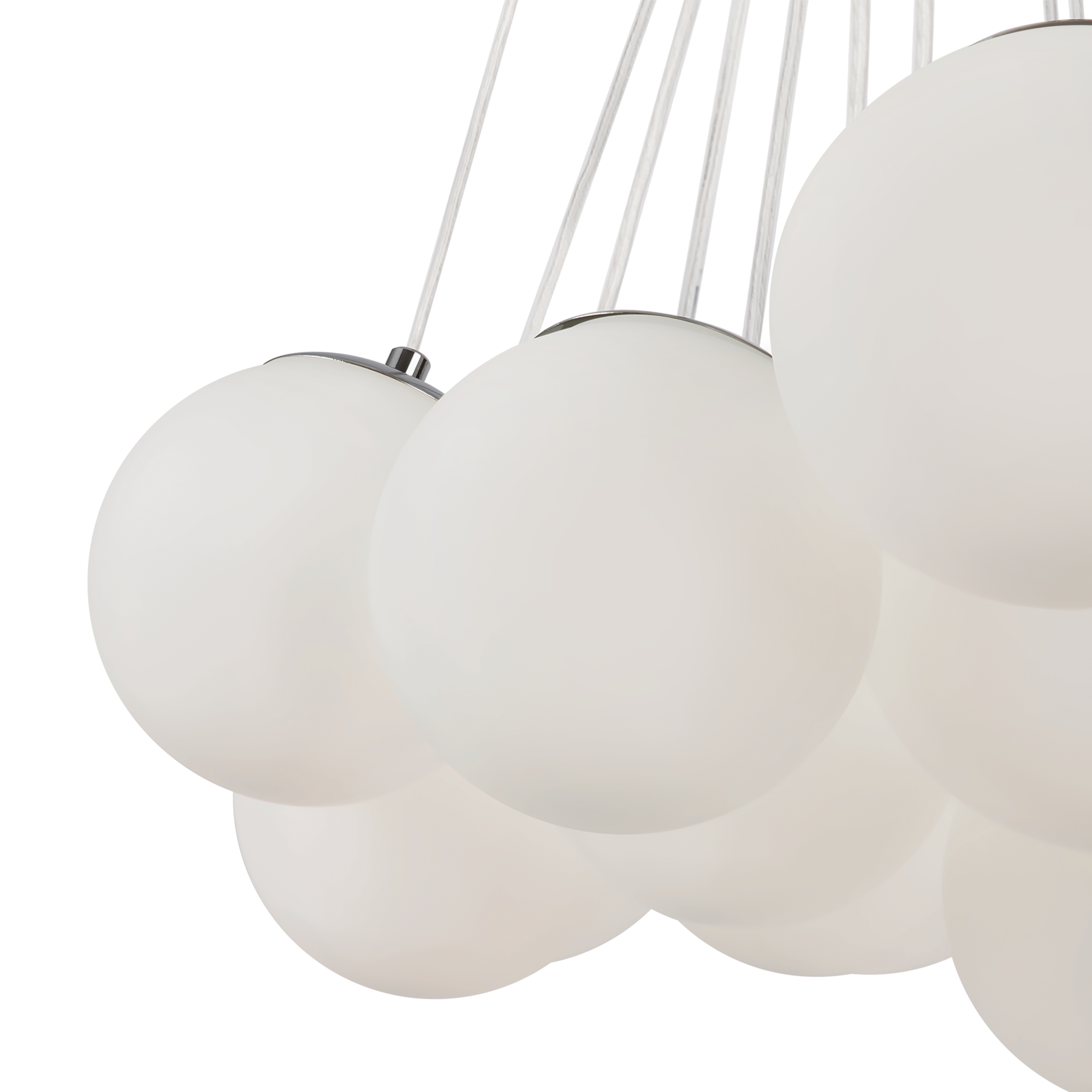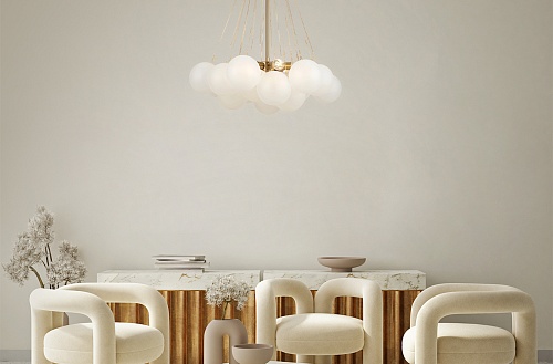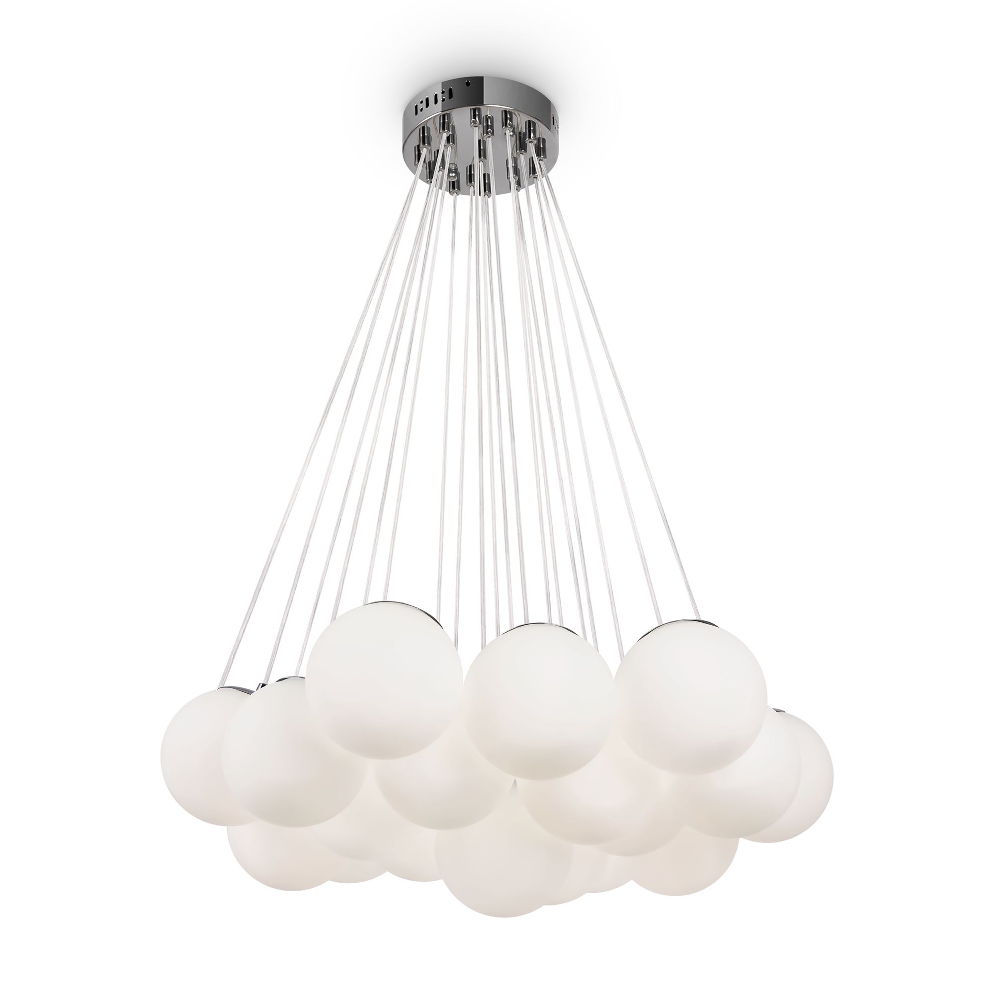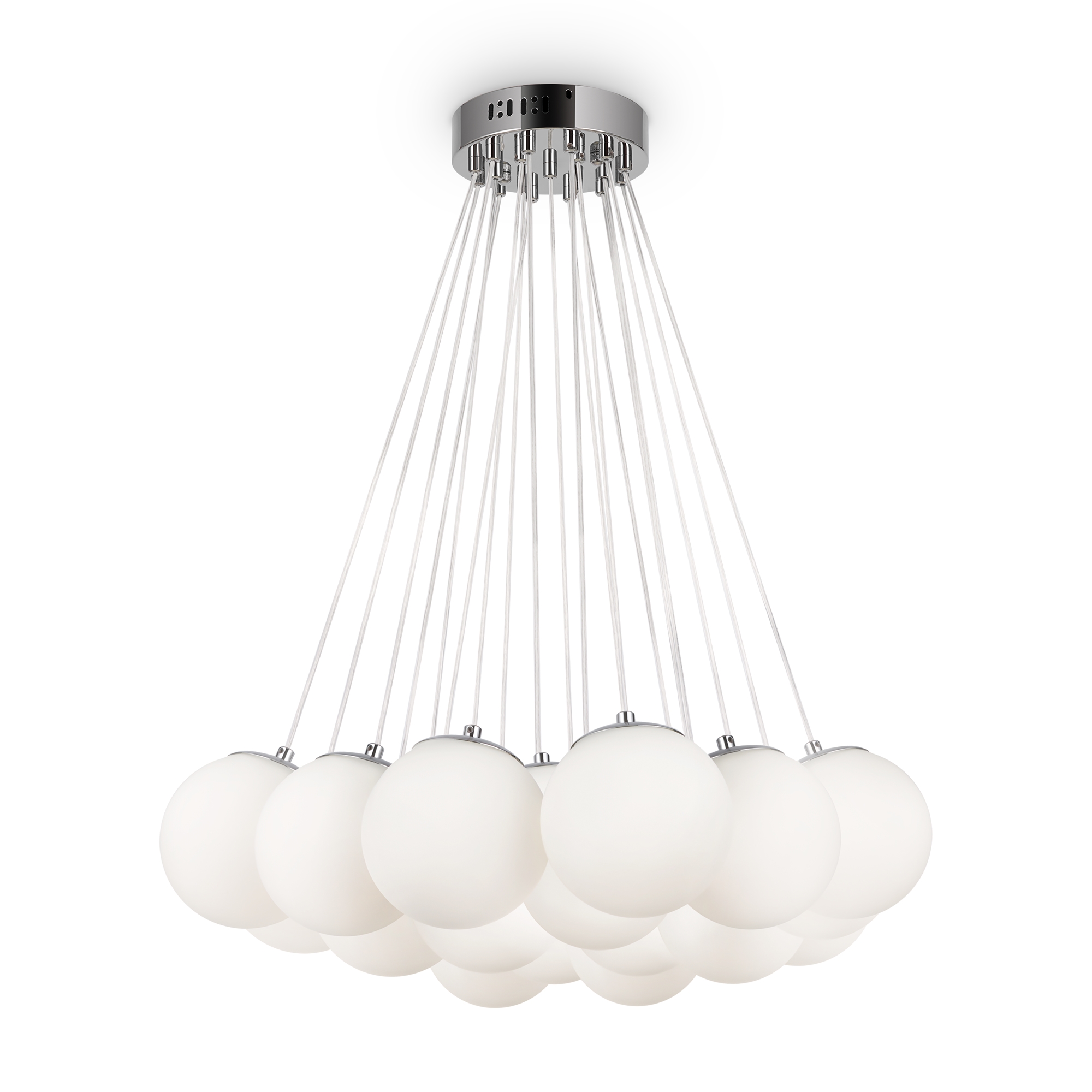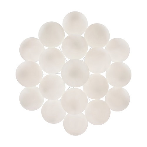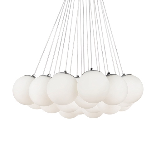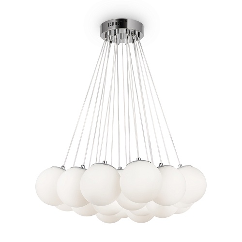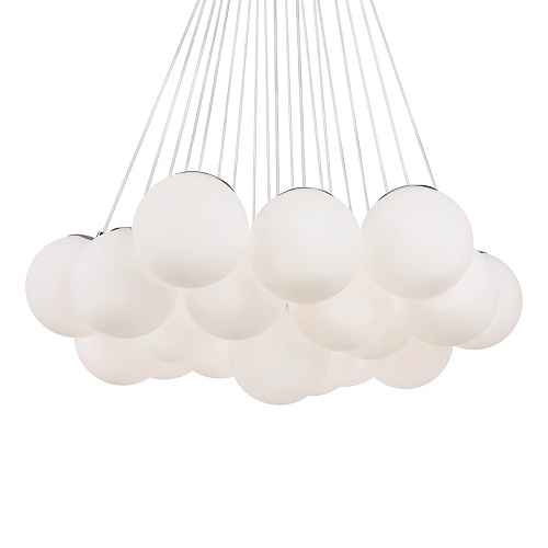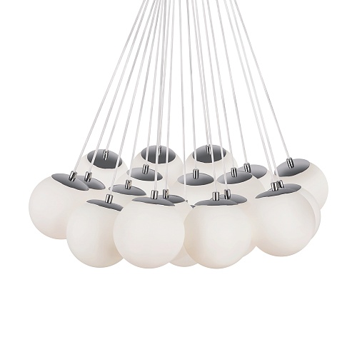 Арматура - металл, оттенки - хром и латунь. Плафоны-сферы из белого матового стекла. Подвесы двух видов: с регулируемой высотой на 7, 13, 19 ламп с цоколем E27 - помещены внутри плафонов на прозрачных проводах, и с фиксированной высотой на 6 ламп с цоколем Е14 - незаметно расположены над декоративным "облаком" плафонов.