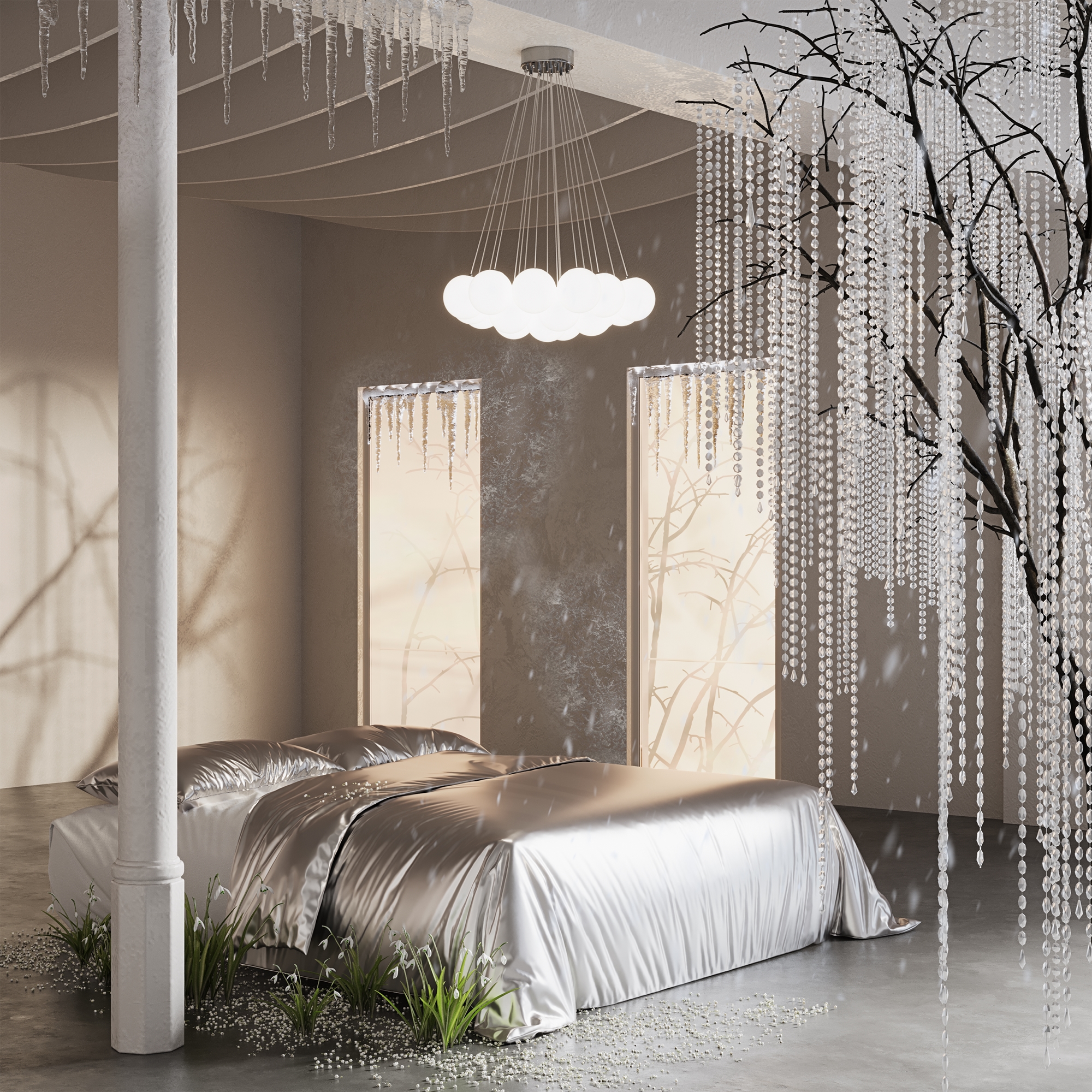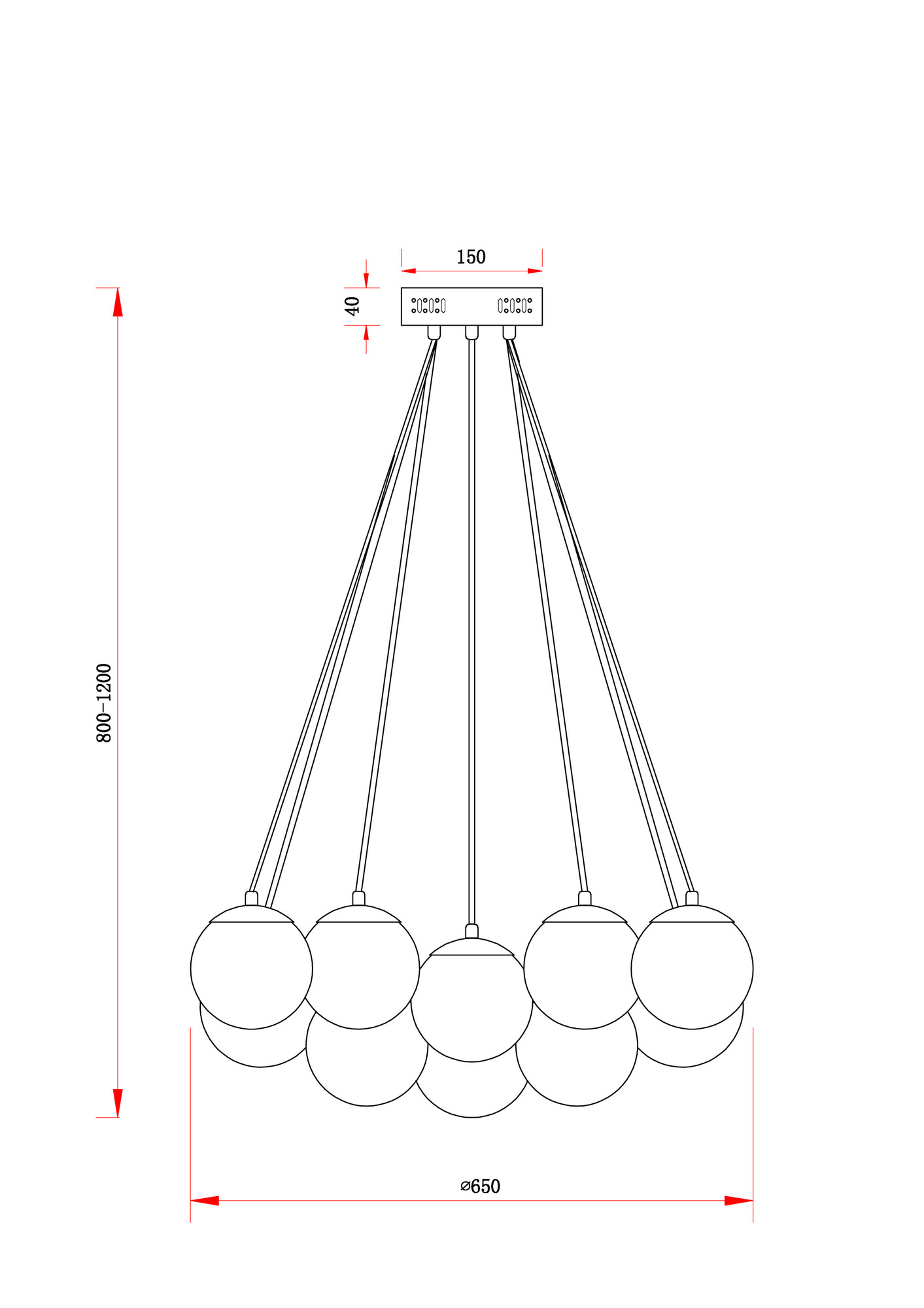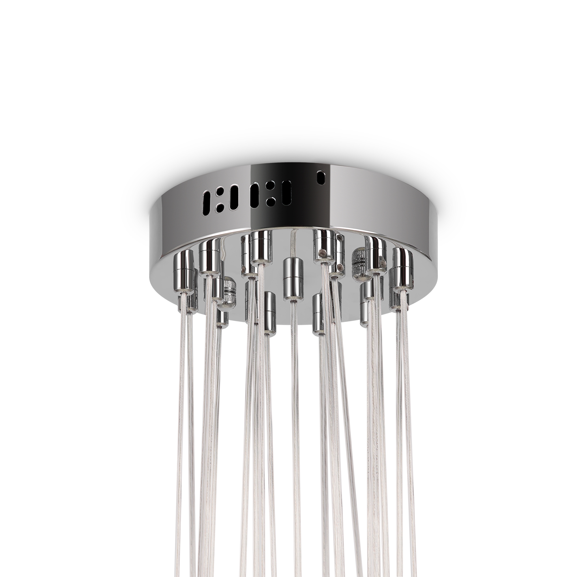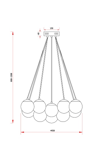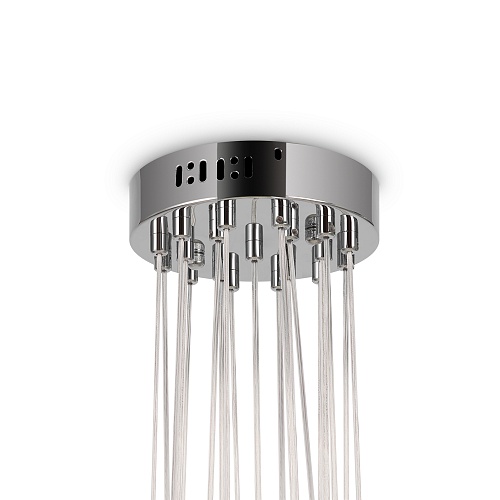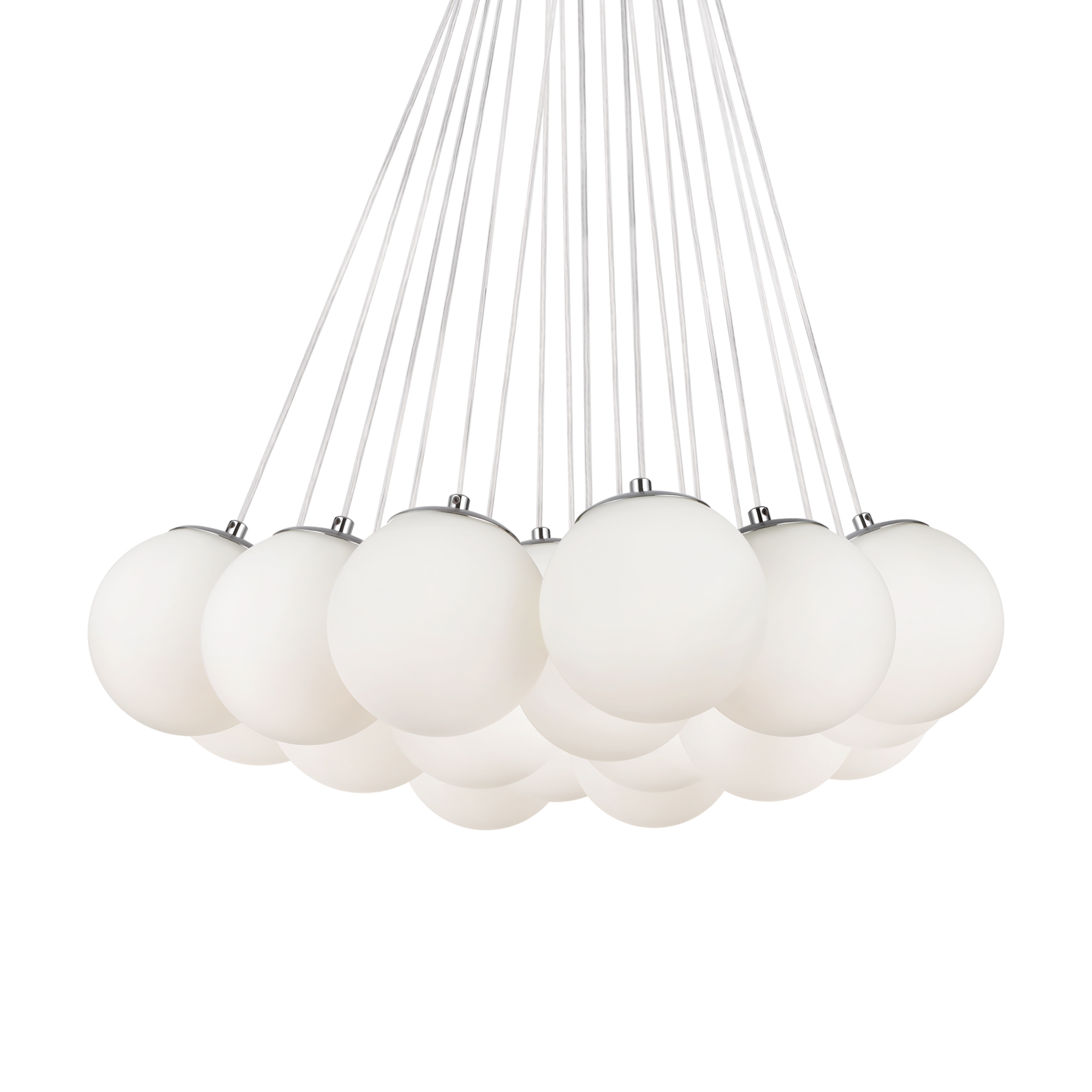 Арматура - металл, оттенки - хром и латунь. Плафоны-сферы из белого матового стекла. Подвесы двух видов: с регулируемой высотой на 7, 13, 19 ламп с цоколем E27 - помещены внутри плафонов на прозрачных проводах, и с фиксированной высотой на 6 ламп с цоколем Е14 - незаметно расположены над декоративным "облаком" плафонов.