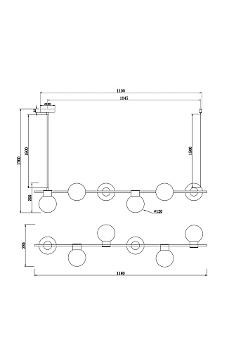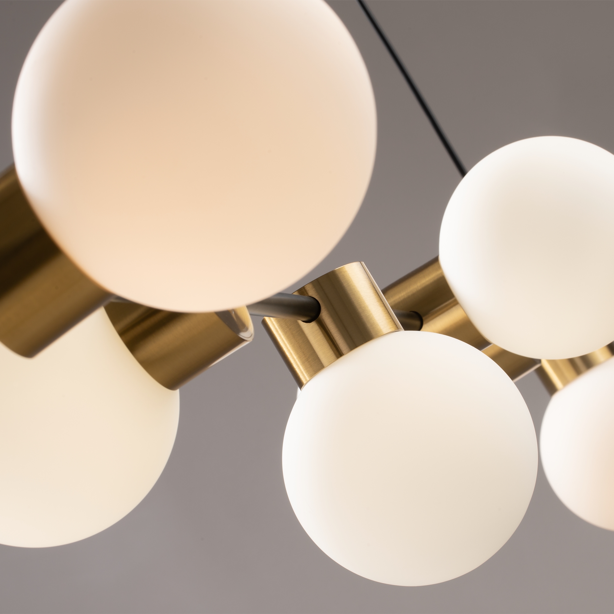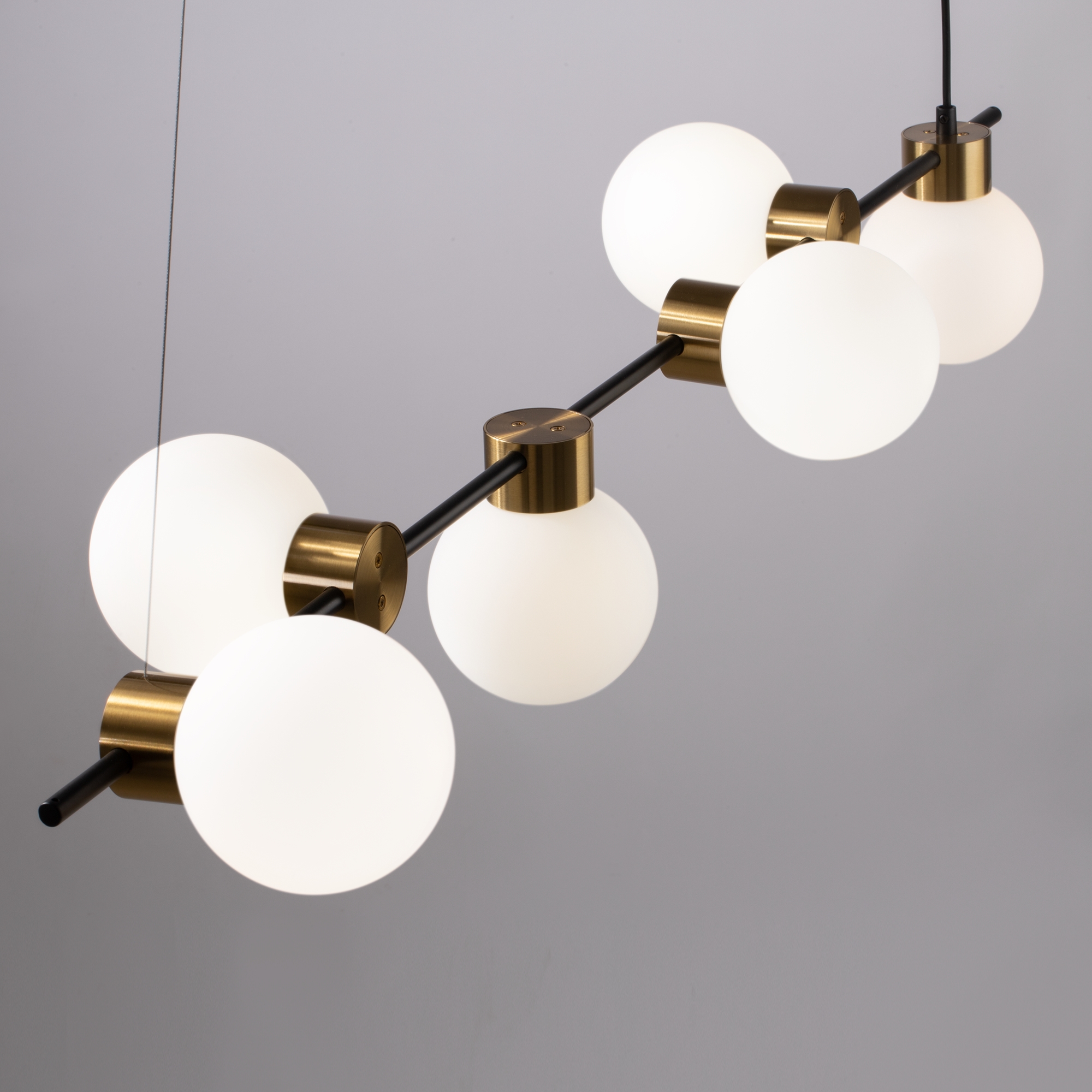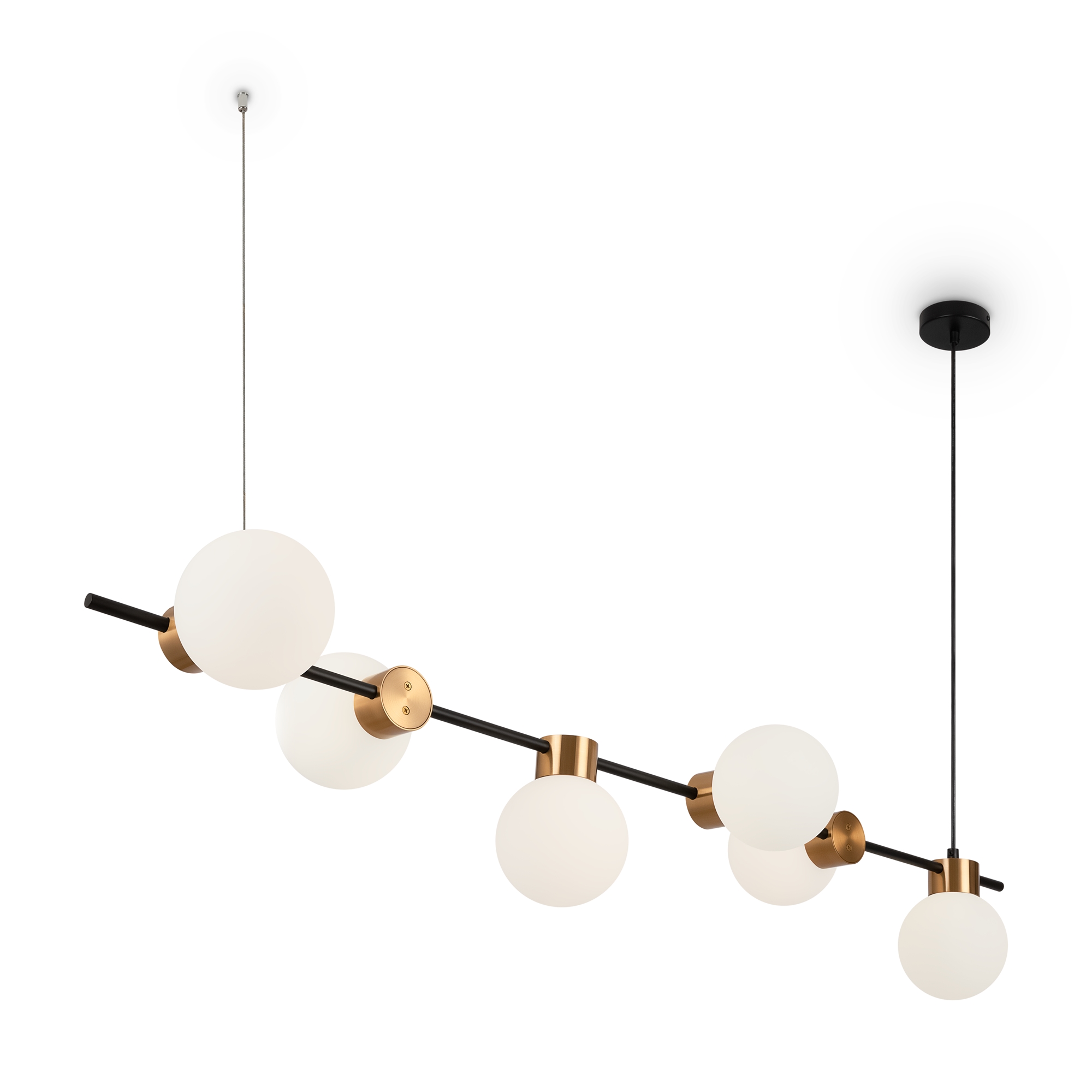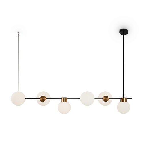 Металлическая арматура, цвет - черный + латунь. Стеклянные плафоны в двух оттенках - матовый белый или дымчатый. Направление плафонов в разные стороны позволяет распределить свет максимально равномерно. Источник светал - лампы с цоколем G9.