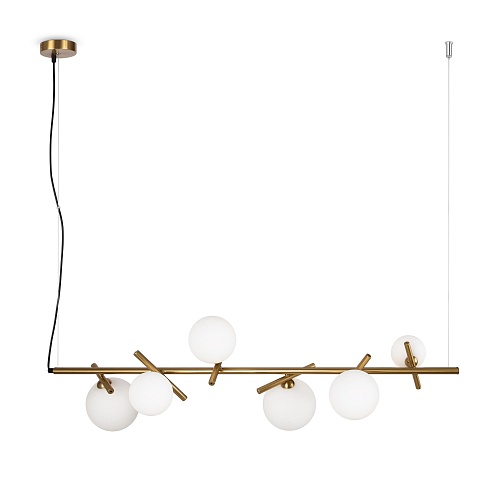 Материал арматуры — рифленый металл, цвет — латунь. Плафоны-сферы из белого матового стекла для мягкого заливающего света. Воздушный образ плафонов, строгие тонкие линии арматуры придадут интерьеру изящество и легкость. Высота подвесов регулируется. Источник света — лампы с цоколем G9.