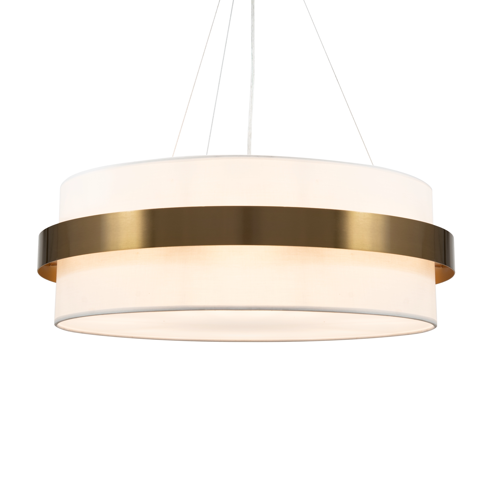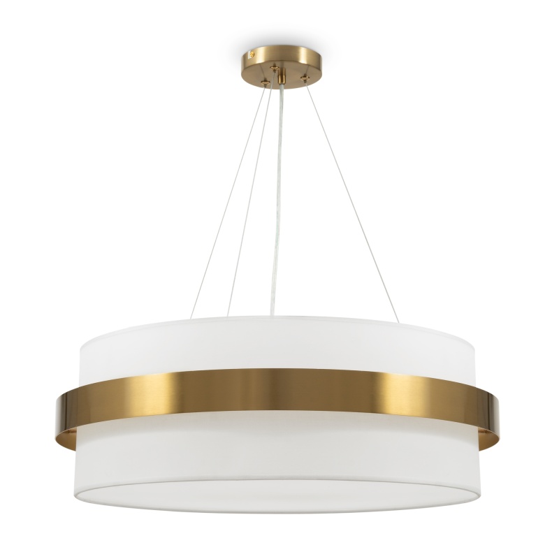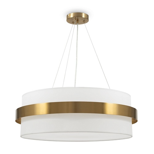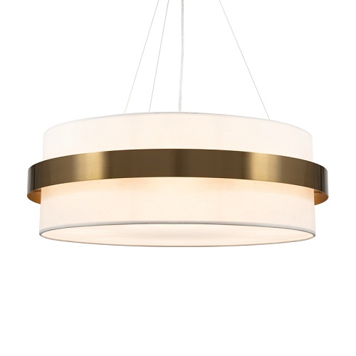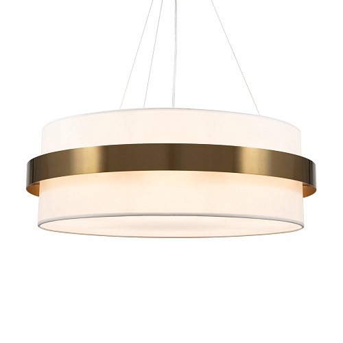 Цилиндрической формы абажур из ткани белого цвета. Декоративная парящая окантовка из металла в цвет арматуры. Регулируется по длине. Компактные размеры подходят для низких потолков и небольших интерьеров. Металлическая арматура, цвет - латунь и никель. Источник света — лампа с цоколем Е14, E27 и для настенного бра дополнительный LED с температурой свечения 3000 K.
