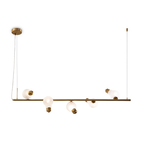 Металлическая арматура, цвета — чёрный и латунь. Прозрачные плафоны-лампочки из стекла в тон арматуры хаотично “разбросаны” по острову светильника. Подвесы регулируются по высоте. Источник света — лампа с цоколем G9.