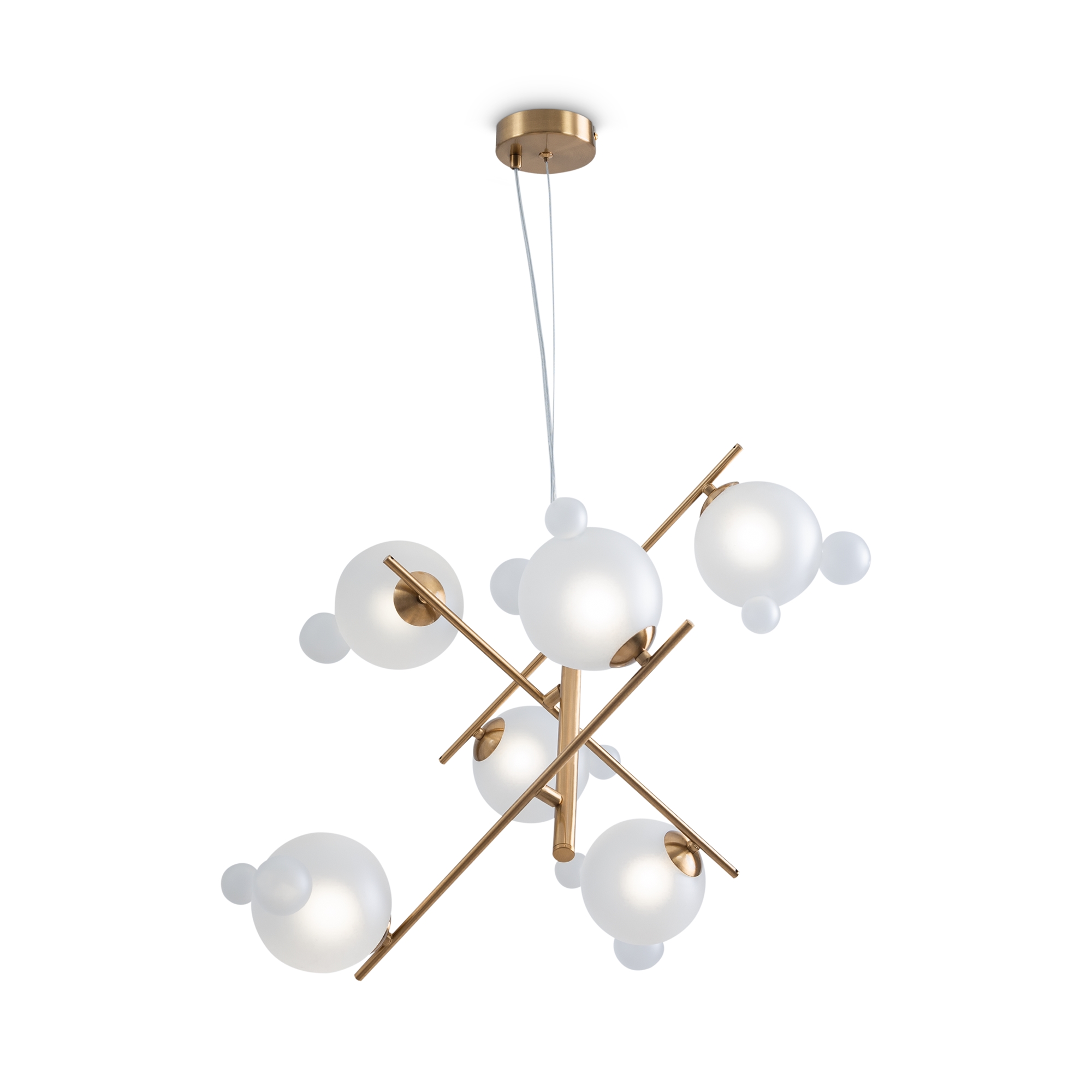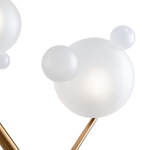 Арматура — металл, цвет— латунь. Белые плафоны из стекла с декоративными “ушками” - напоминают образ знаменитого диснеевского героя. Ассиметричный силуэт создает эффект подвижной игры. Высота подвесных моделей регулируется. Источник света - лампа с цоколем G9