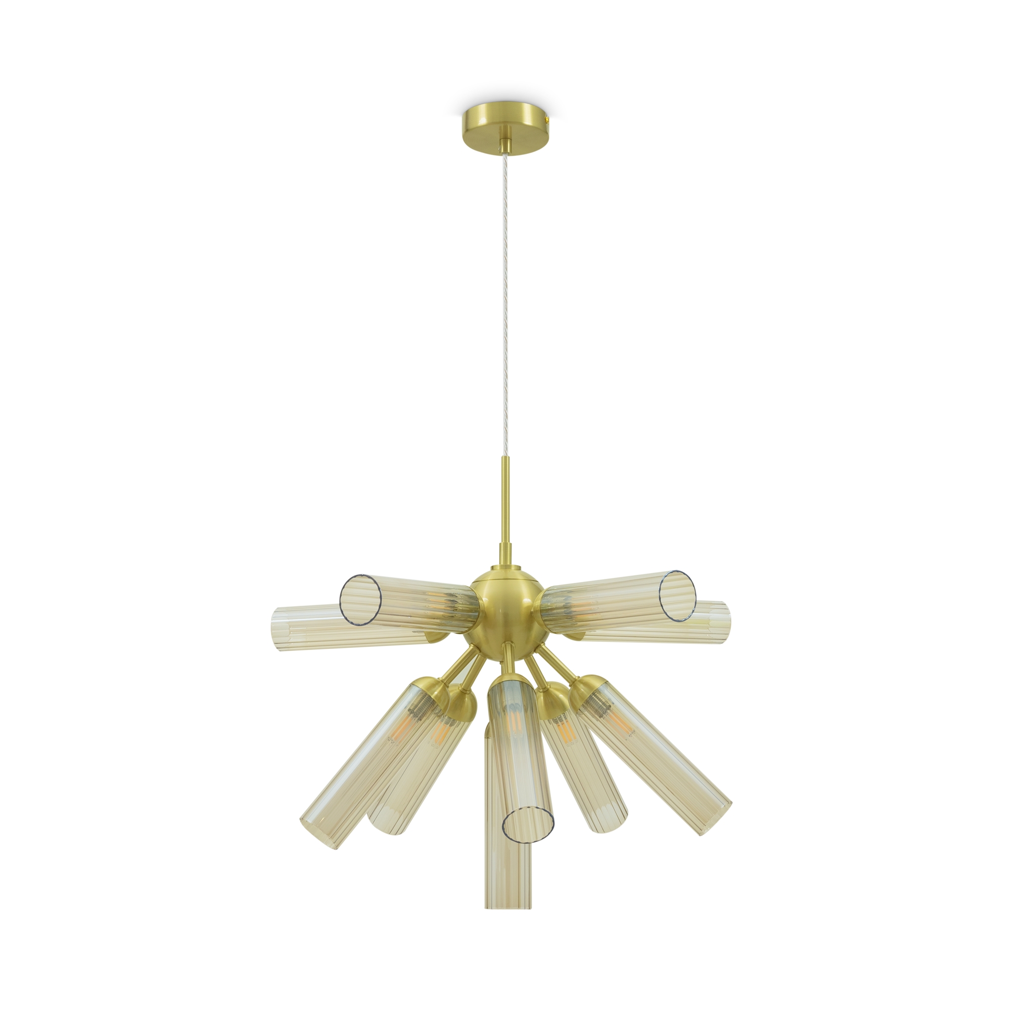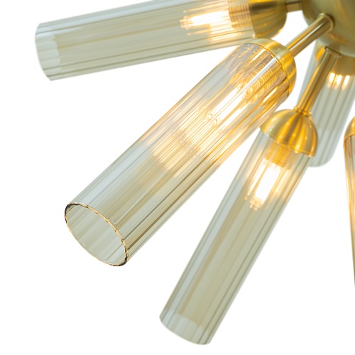 Арматура из металла, цвет — золото. Рельефные плафоны в тренде ZIGZAG. Материал — стекло, цвет — янтарный. Высота подвесных светильников регулируется. Плафоны закреплены на металлическую сферу. Источник света — лампа с цоколем G9.