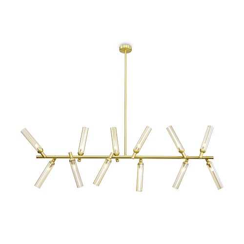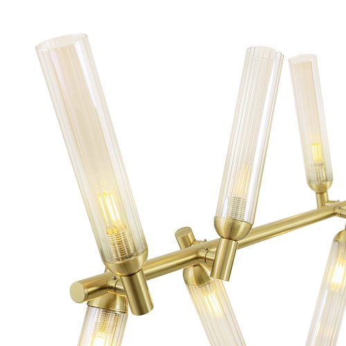 Арматура из металла, цвет — золото. Рельефные плафоны в тренде ZIGZAG. Материал — стекло, цвет — янтарный. Высота подвесных светильников регулируется. Плафоны закреплены на металлическую сферу. Источник света — лампа с цоколем G9.
