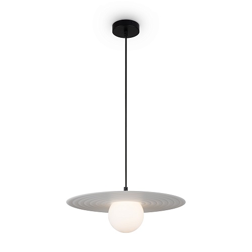 Арматура — металл, цвета — чёрный и белый. Матовый белый плафон с декоративным элементом — металлической тарелкой. Можно регулировать минимальную и максимальную высоту. Лампа с цоколем G9 служит источником света.
