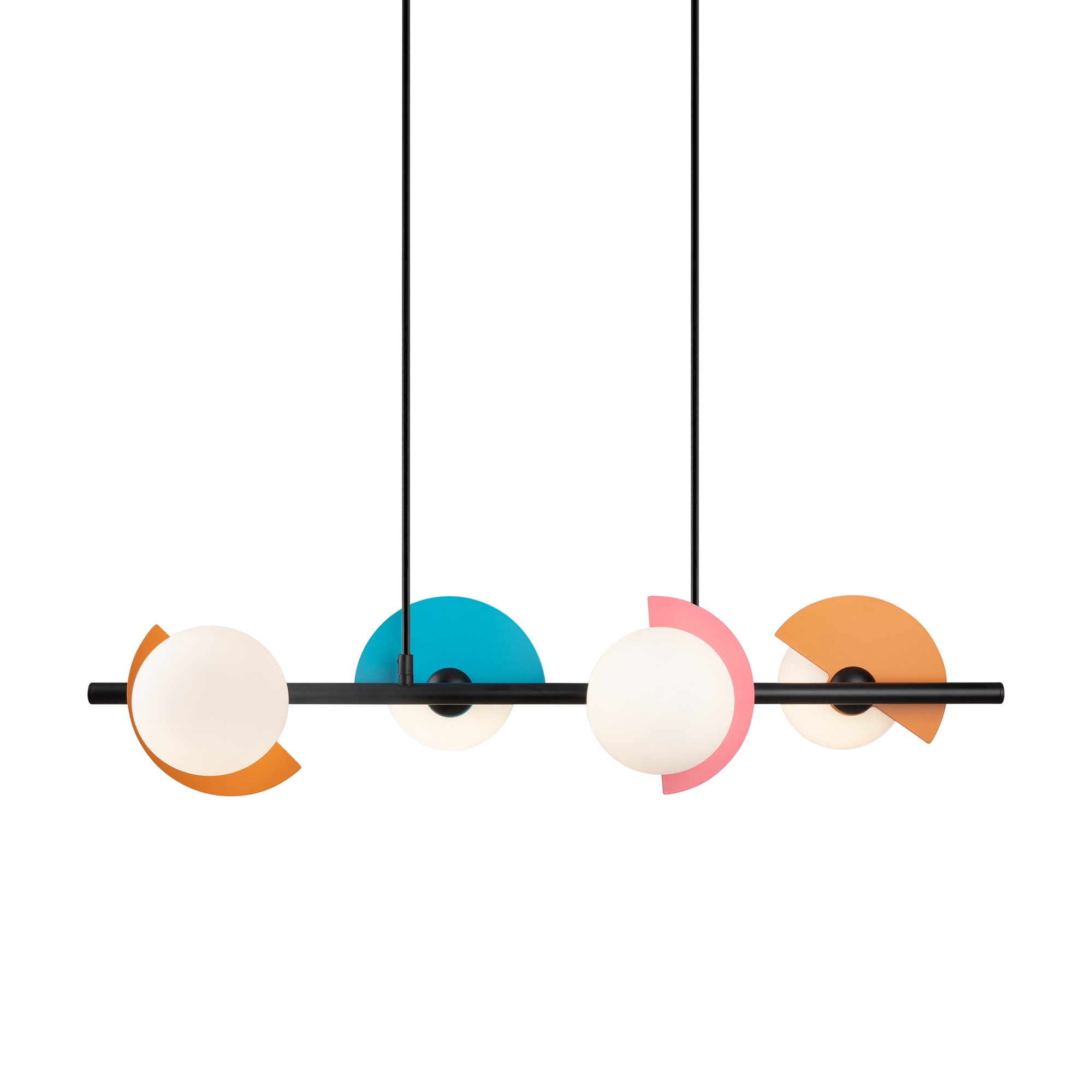 Арматура — металл, цвет — разноцветный или латунь. Белые матовые плафоны из стекла украшены металлическими золотыми или цветными лепестками. Динамичный дизайн для интерьеров в стиле Мемфис. Разнообразие форм в одной конструкции позволяет создать яркое освещение в больших комнатах. Высота регулируется. Источником света служит лампа с цоколем G9.