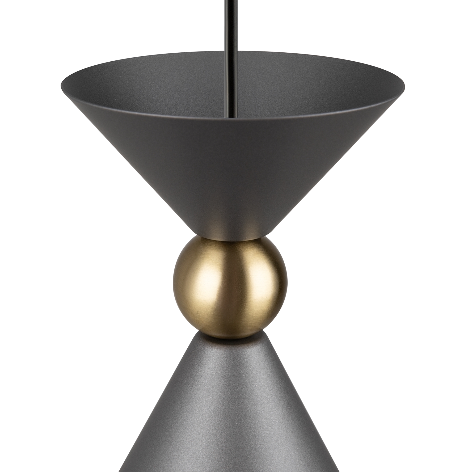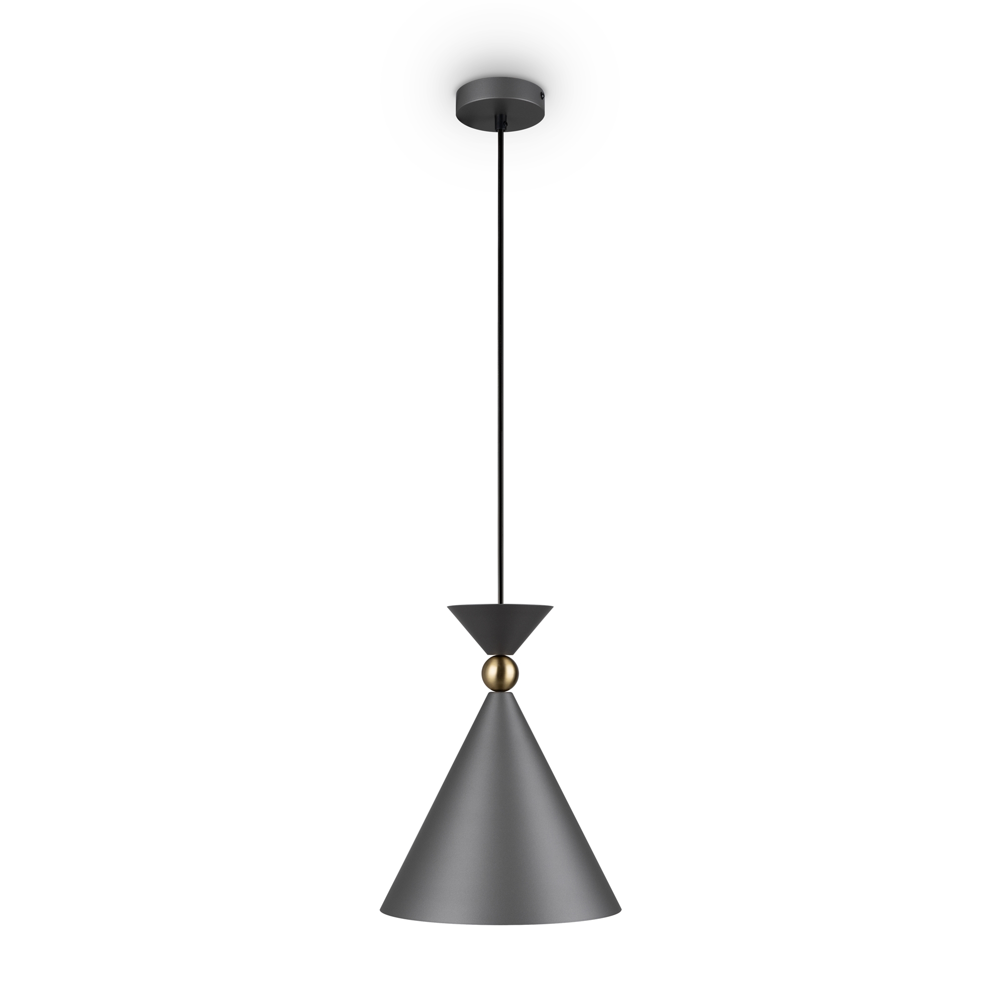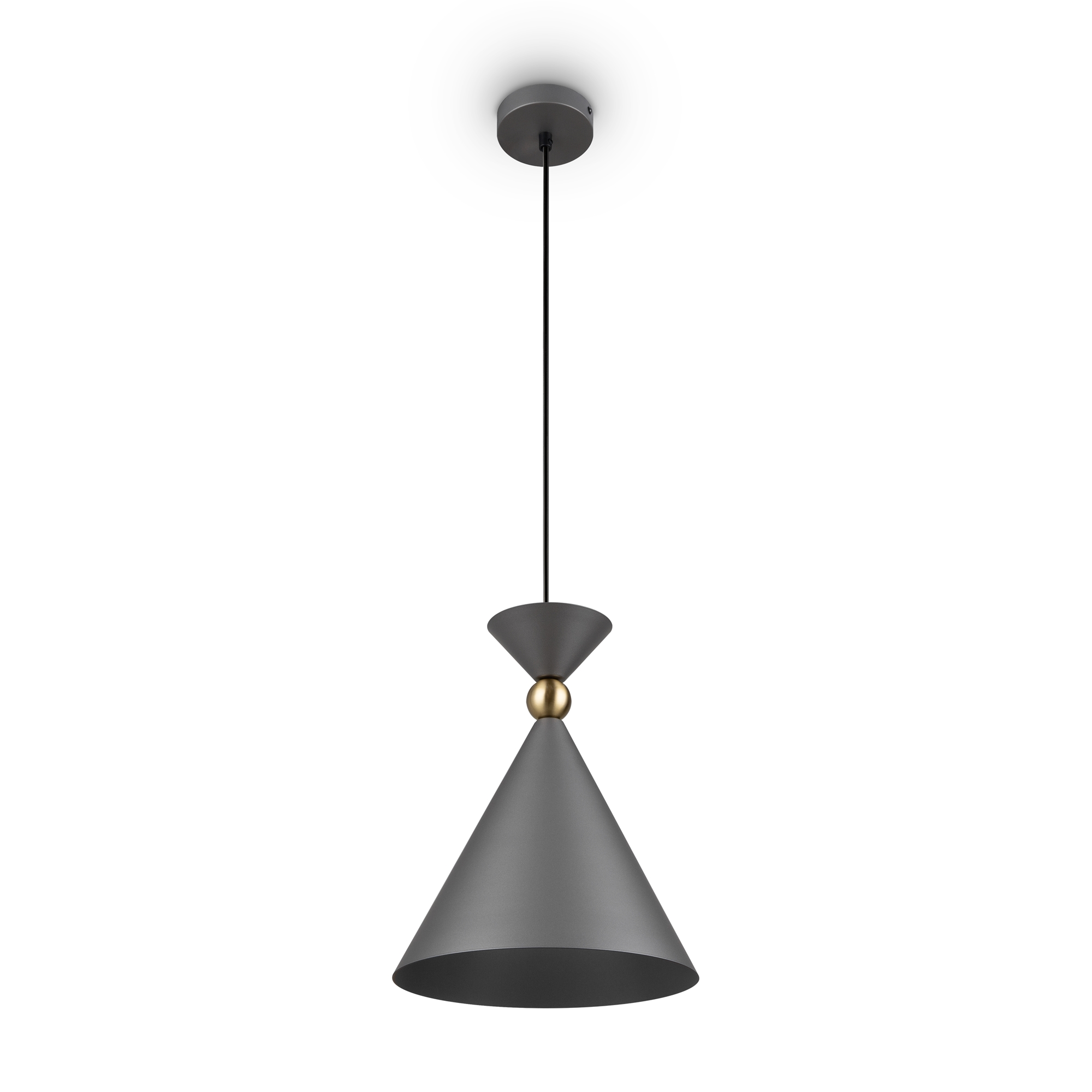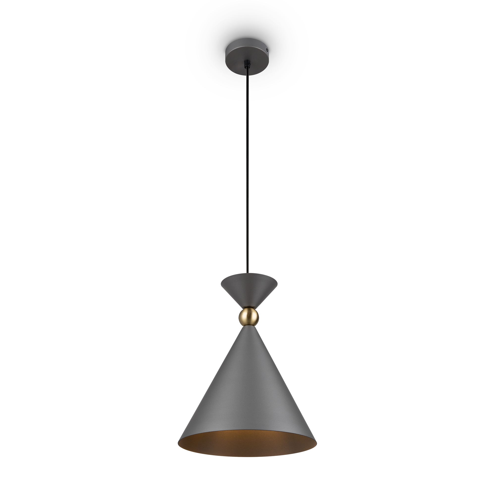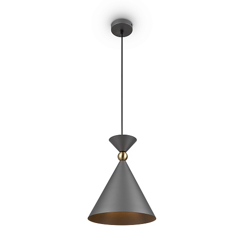 Арматура и плафоны из металла в двух цветах — белом и сером. Плафон состоит из 2-х конусов разных размеров, соединённых золотистым декоративным элементом. Высота регулируется. Идеальны для составления композиций. Источник света — лампа с цоколем Е27.