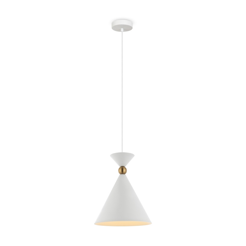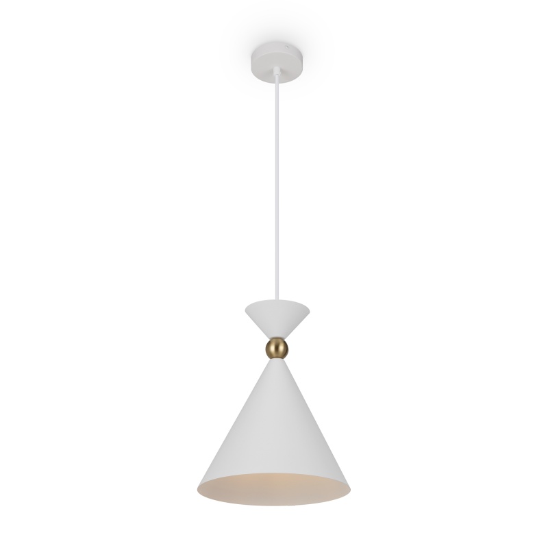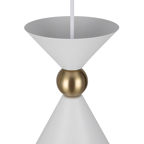 Арматура и плафоны из металла в двух цветах — белом и сером. Плафон состоит из 2-х конусов разных размеров, соединённых золотистым декоративным элементом. Высота регулируется. Идеальны для составления композиций. Источник света — лампа с цоколем Е27.