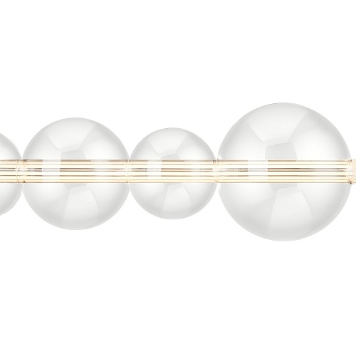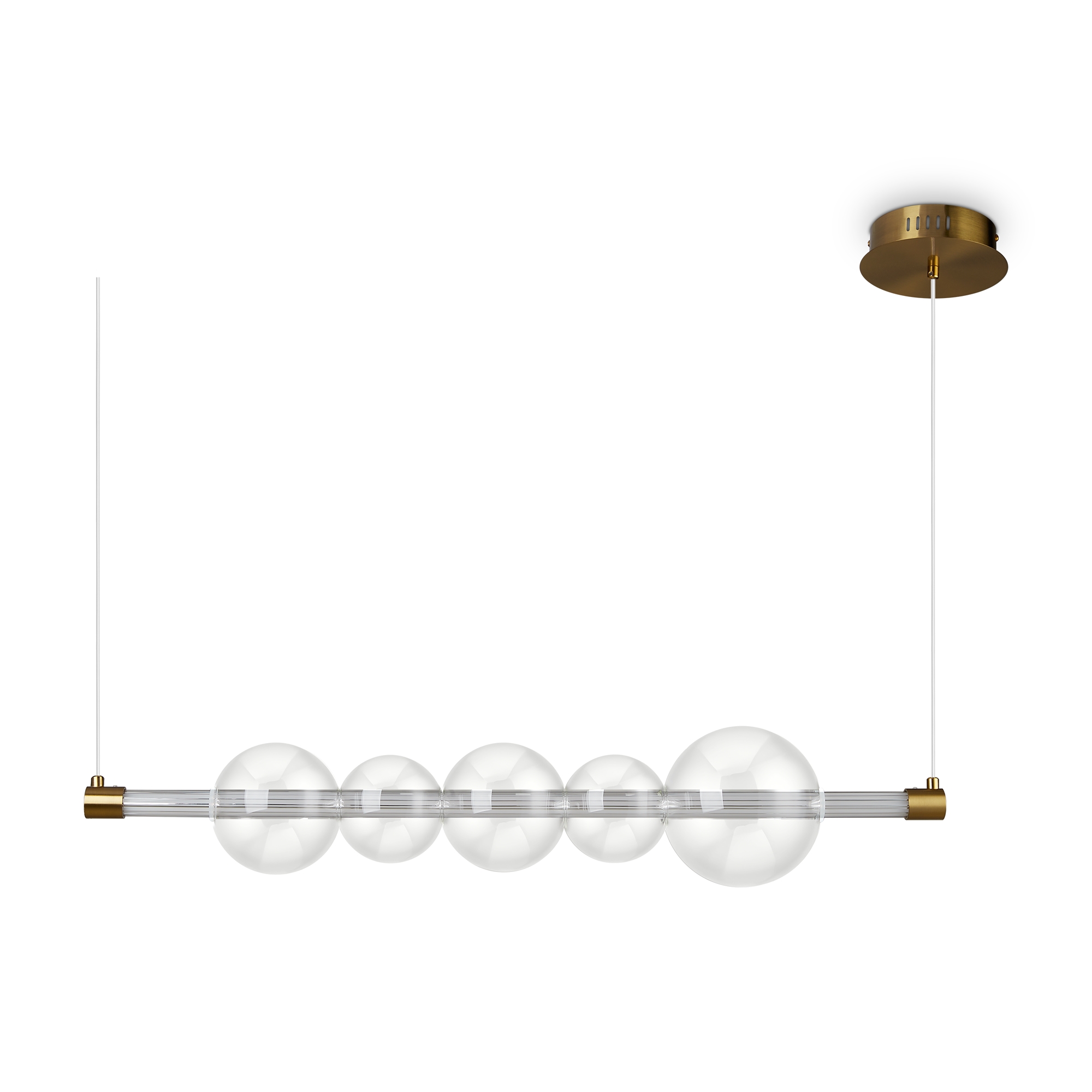 Арматура — металл, цвет — латунь. Тренд «invisible light» - LED-источник света скрыт в горизонтальной стеклянной трубке, пронизывая ряд декоративных плафонов-шаров разного размера из прозрачного стекла. Воздушная минималистичная горизонтальная конструкция. Регулируемая высота. Цветовая температура - 3000К.