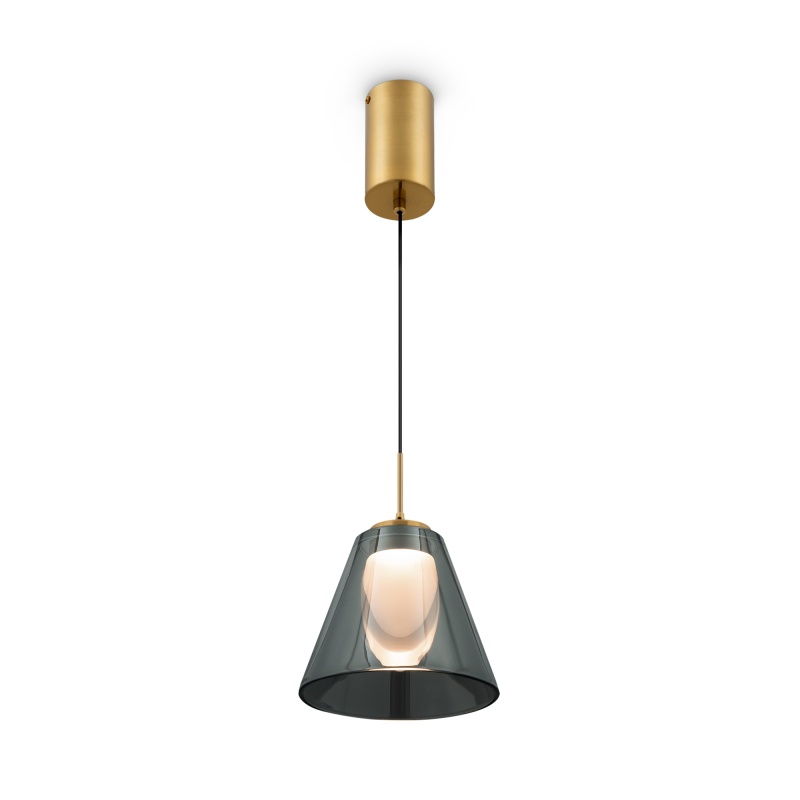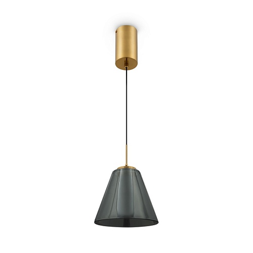 Арматура — металл, цвет — латунь. Плафоны из прозрачного стекла с дымчатым оттенком в форме овала, круга или конуса. Универсальный минималистичный дизайн позволяет составлять комбинации из нескольких подвесов. Регулируемая высота. Тренд «invisible light» - LED-источник света утоплен в основание плафона. Цветовая температура - 3000К.