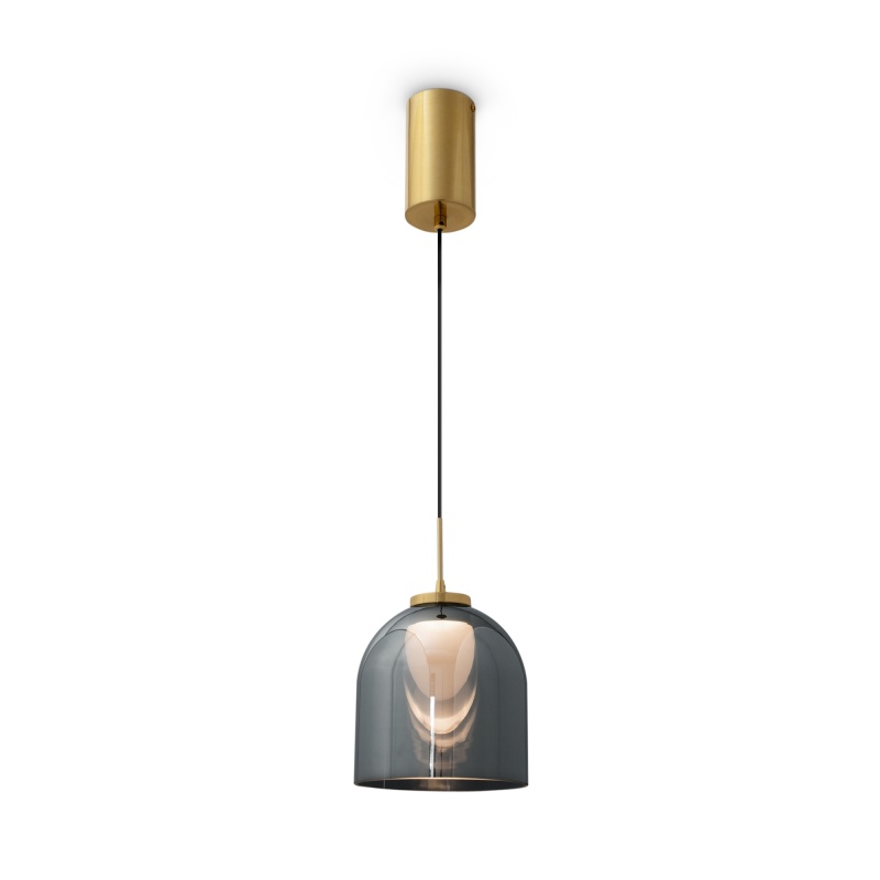 Арматура — металл, цвет — латунь. Плафоны из прозрачного стекла с дымчатым оттенком в форме овала, круга или конуса. Универсальный минималистичный дизайн позволяет составлять комбинации из нескольких подвесов. Регулируемая высота. Тренд «invisible light» - LED-источник света утоплен в основание плафона. Цветовая температура - 3000К.