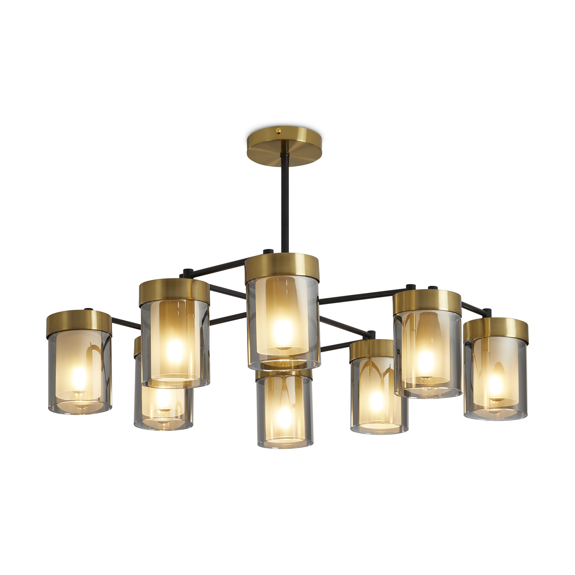 Арматура - металл в двух востребованных оттенках латунь и черный. Плафоны из двойного стекла дымчатого оттенка, внутри белый матовый. Трендовая форма плафонов в виде цилиндра. Потолочные светильники подойдут для помещений с низкими потолками. Источник света лампа. Цоколь E14