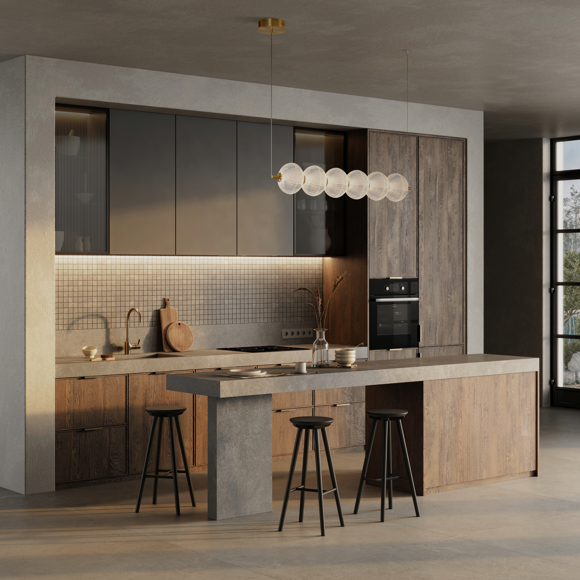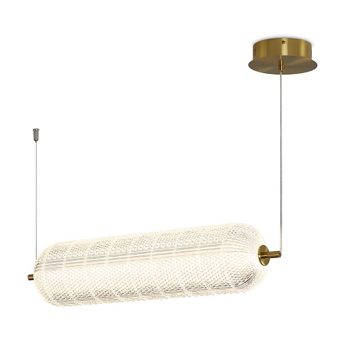 Арматура выполнена из металла в цвете латунь. Прозрачные плафоны. Вертикальные и горизонтальные подвесные светильники разных размеров. LED источник света. Цветовая температура 3000К.