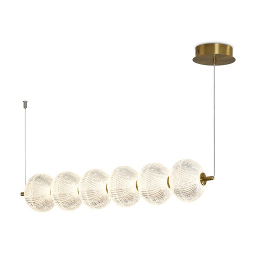 Арматура выполнена из металла в цвете латунь. Прозрачные плафоны. Вертикальные и горизонтальные подвесные светильники разных размеров. LED источник света. Цветовая температура 3000К.