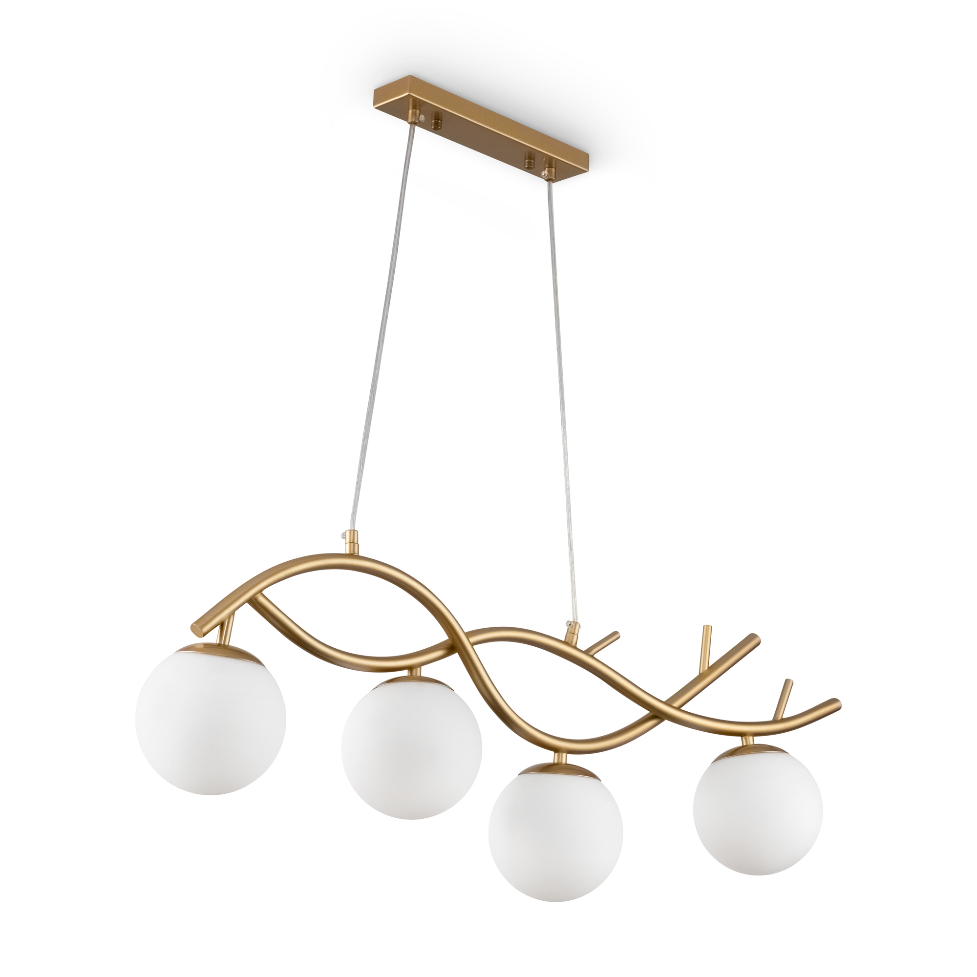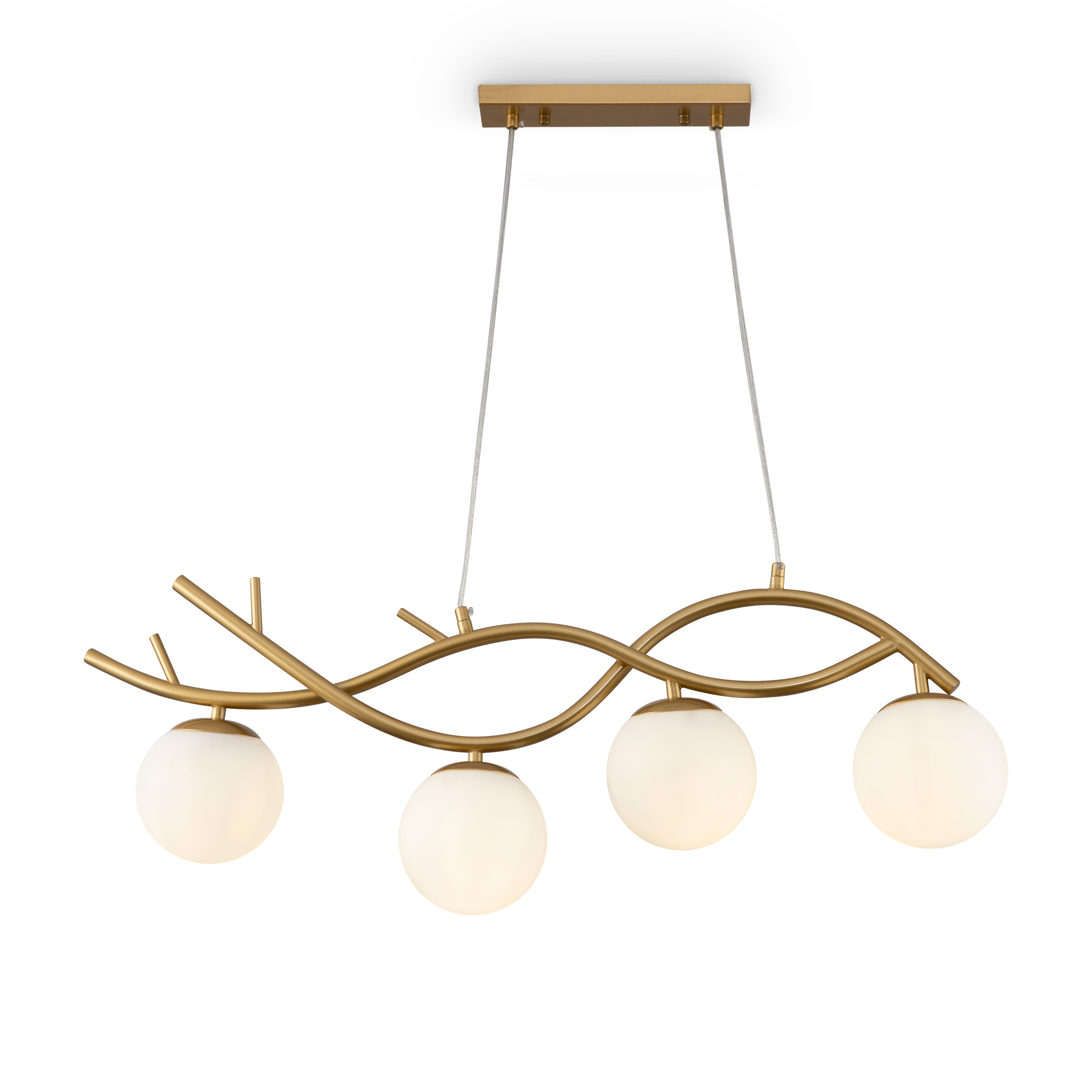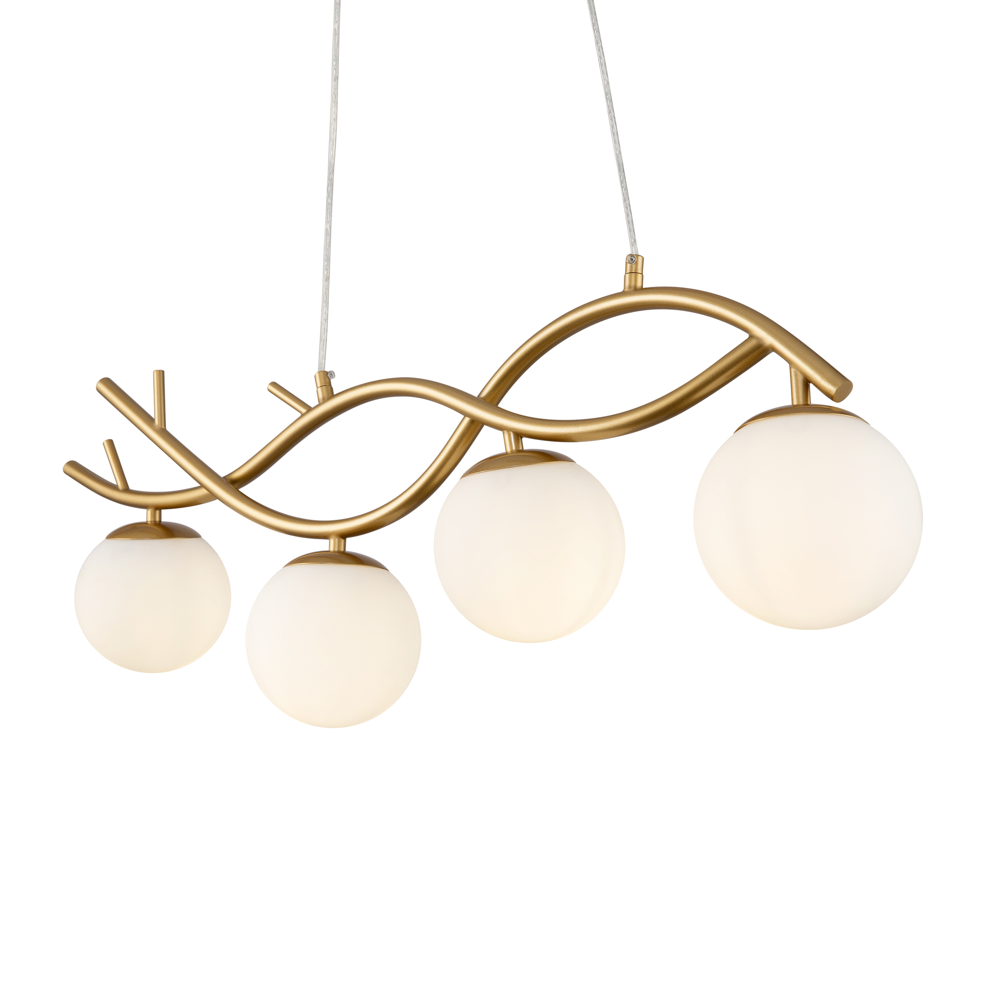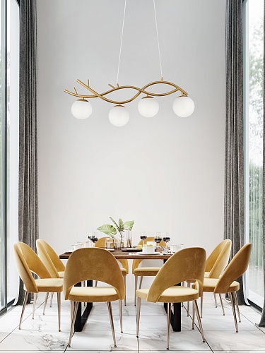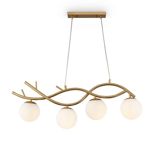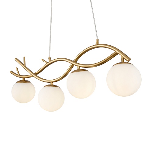 Металлическая арматура. Оттенок – латунь. Стеклянные плафоны сферической формы. Цвет плафонов – матовый белый. Оригинальный силуэт арматуры напоминает о ветвях деревьев. Источник света – лампа с цоколем E27.