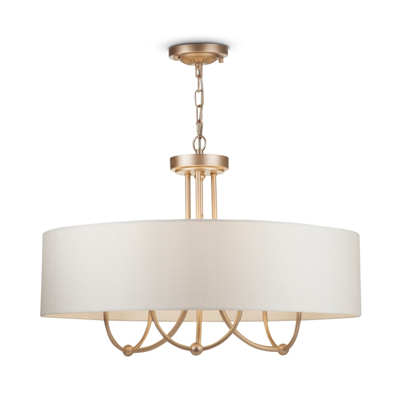 Металлическая арматура в цвете матового золота. Абажур с тиснением – ткань на ПВХ, цвет – кремовый. Декоративные элементы с флористическим узором. Регулируемая высота. Источник света - лампа с цоколем Е14.