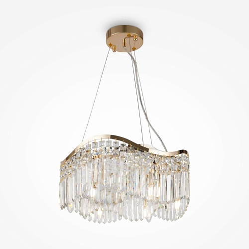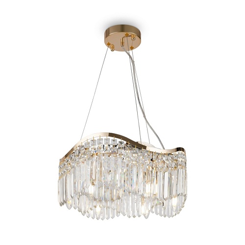 Металлическая арматура в золотом цвете. Декоративные подвески различной формы и огранки. Оригинальные волнообразные очертания светильника. Трендовый эффект парения. Ассортимент для общей и зональной подсветки.
