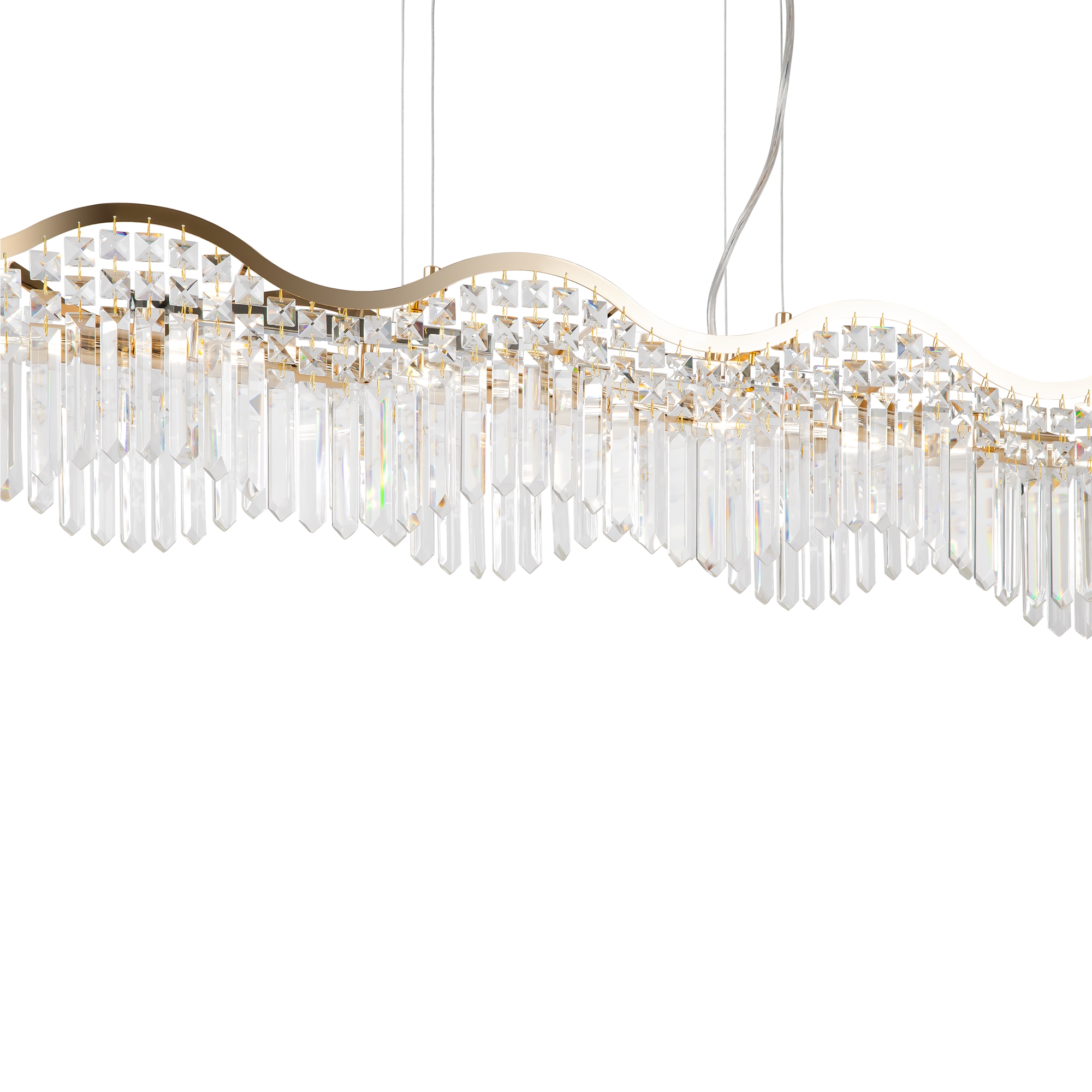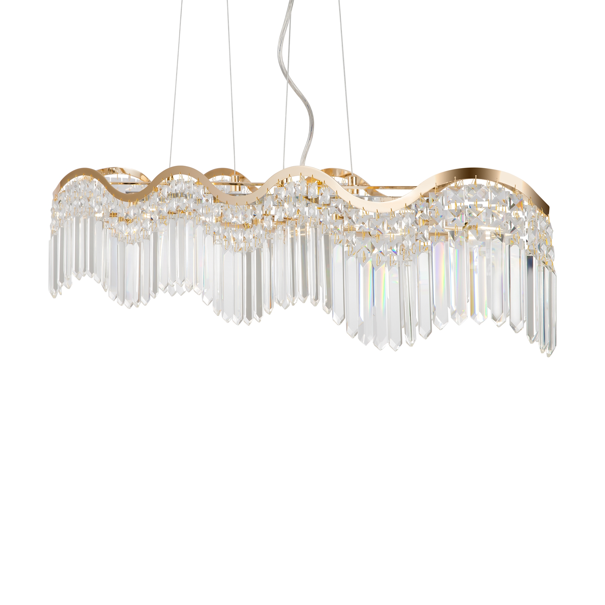 Металлическая арматура в золотом цвете. Декоративные подвески различной формы и огранки. Оригинальные волнообразные очертания светильника. Трендовый эффект парения. Ассортимент для общей и зональной подсветки.