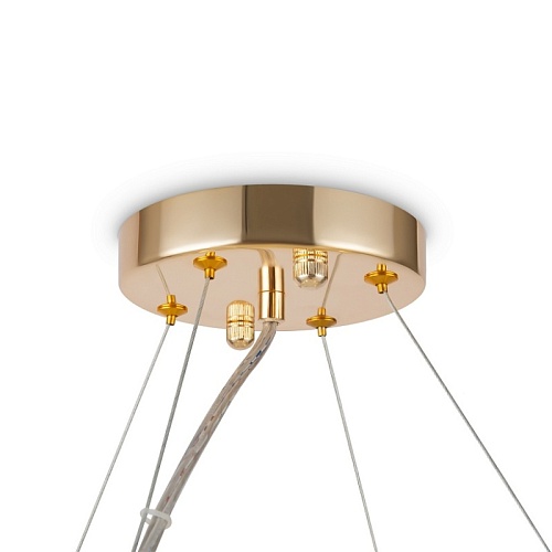 Металлическая арматура в золотом цвете. Декоративные подвески различной формы и огранки. Оригинальные волнообразные очертания светильника. Трендовый эффект парения. Ассортимент для общей и зональной подсветки.