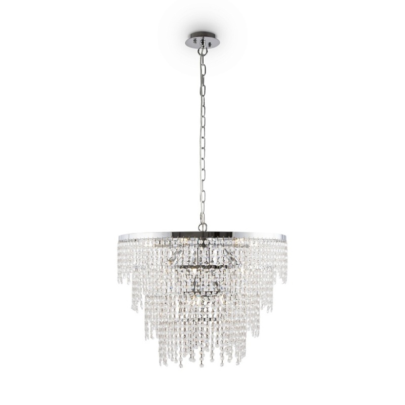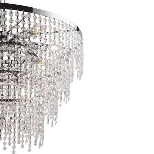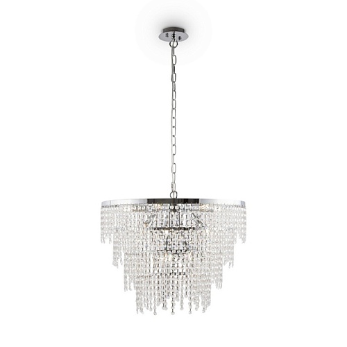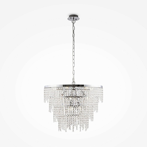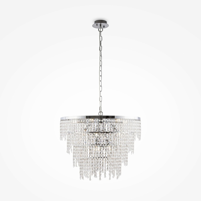 Материал арматуры – металл, цвет – хром. Многоярусный стеклянный декор. Эффектная игра света. Визуально легкий дизайн. Высокие параметры освещенности. Регулируемая высота