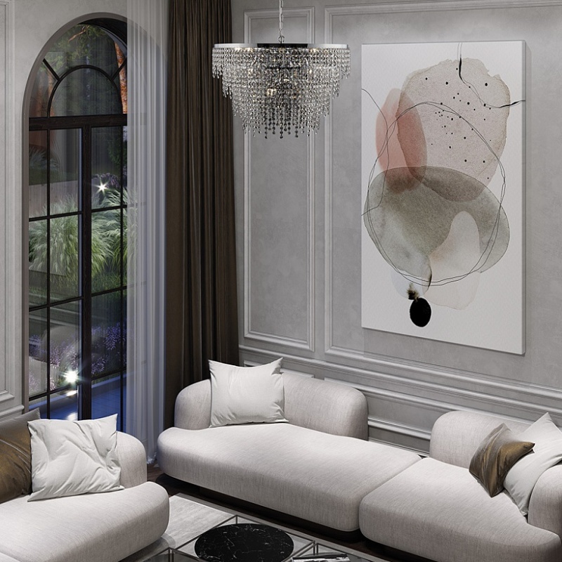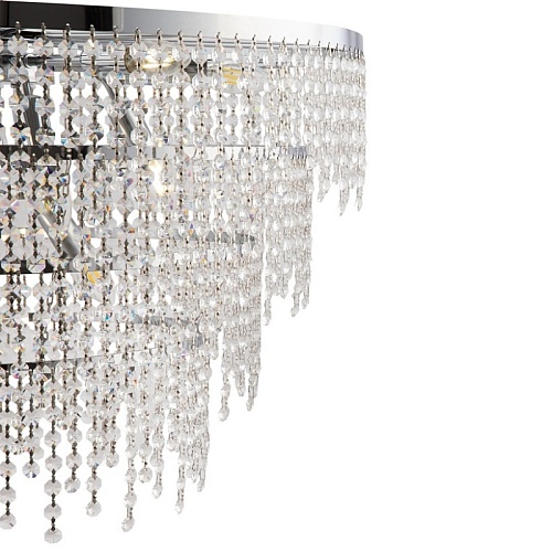 Материал арматуры – металл, цвет – хром. Многоярусный стеклянный декор. Эффектная игра света. Визуально легкий дизайн. Высокие параметры освещенности. Регулируемая высота
