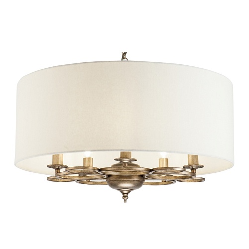 Арматура оттенка античного золота, материал – металл. Абажур из кремового текстиля, нанесенного на ПВХ. Каркас и декор композиции в виде металлических колец. Высота подвесных моделей регулируется.