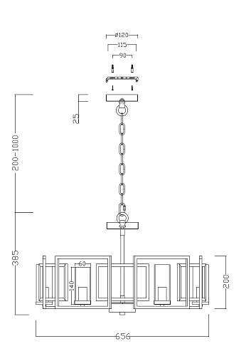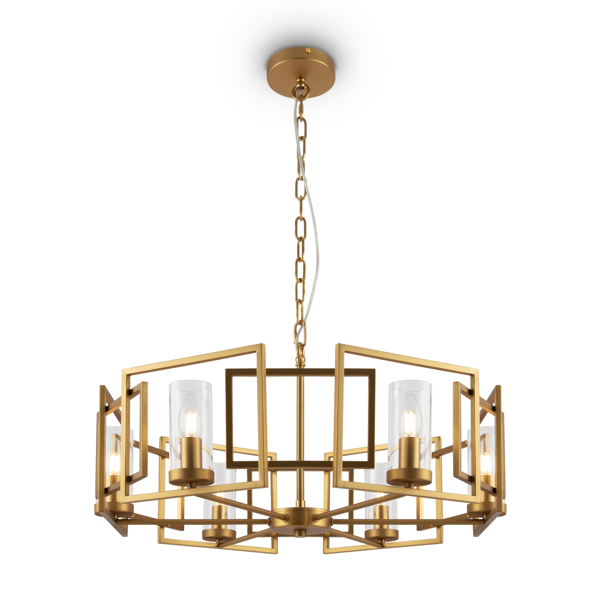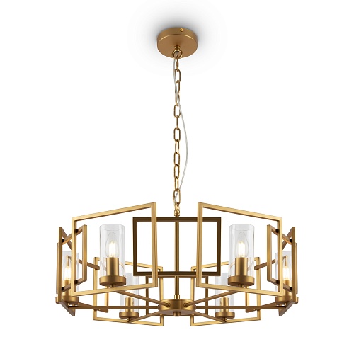 Арматура – металл, цвет – золото. Плафоны из прозрачного стекла. Каркас из наложенных друг на друга металлических рамок. Крепление 2 в 1 – монтаж с цепью и без нее.