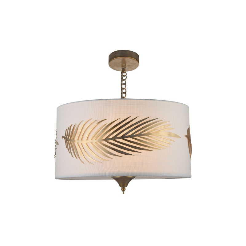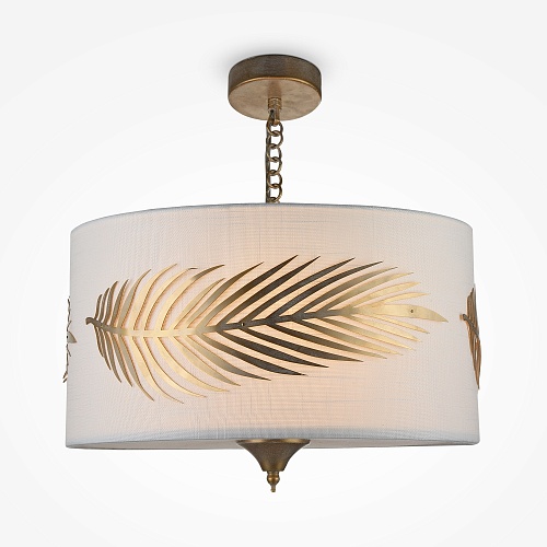 Арматура из металла, цвет – золото. Абажур – белый текстиль на ПВХ. Декор – пальмовая ветвь из листового металла. Рассеиватель фиксируется декоративным наконечником. Высота люстр регулируется.