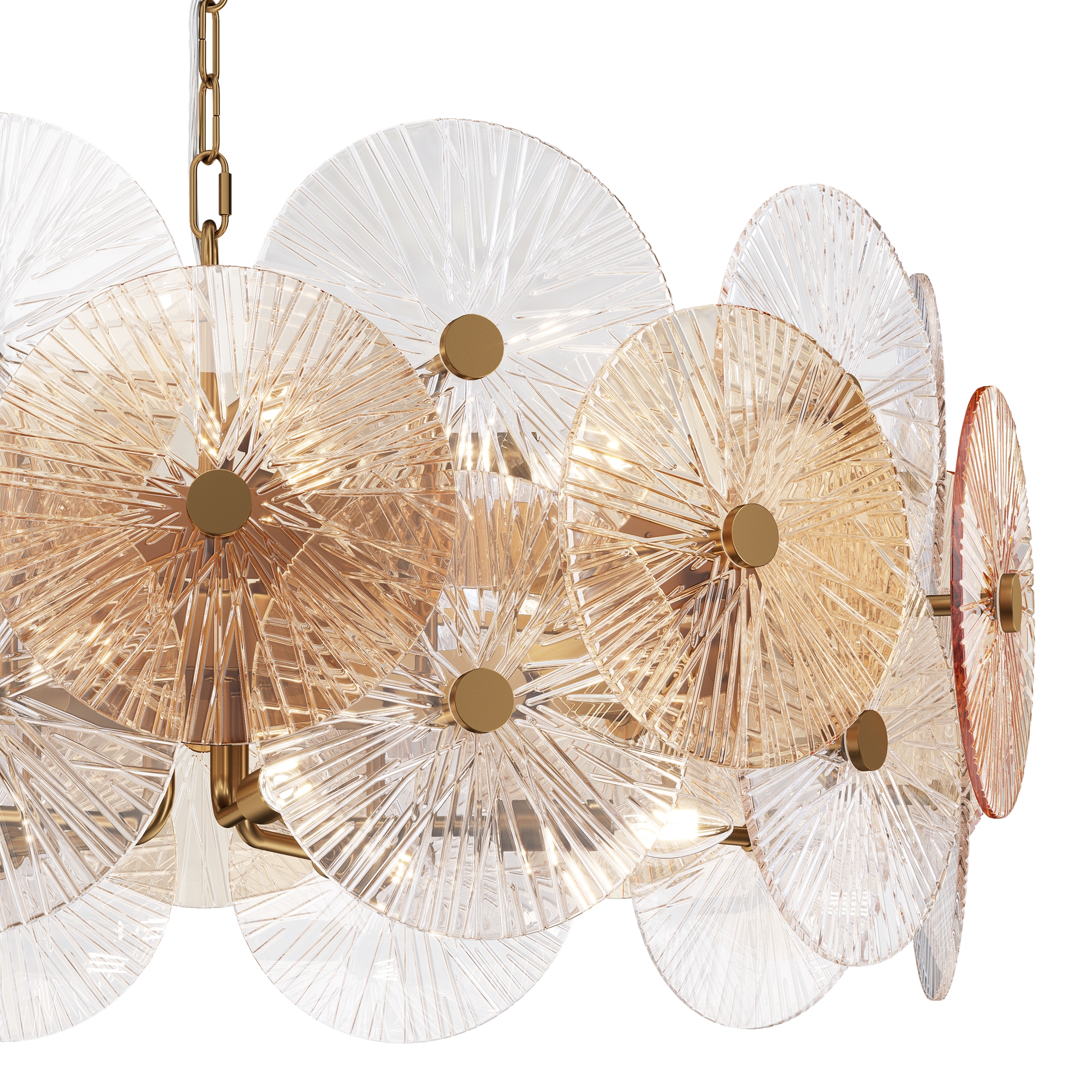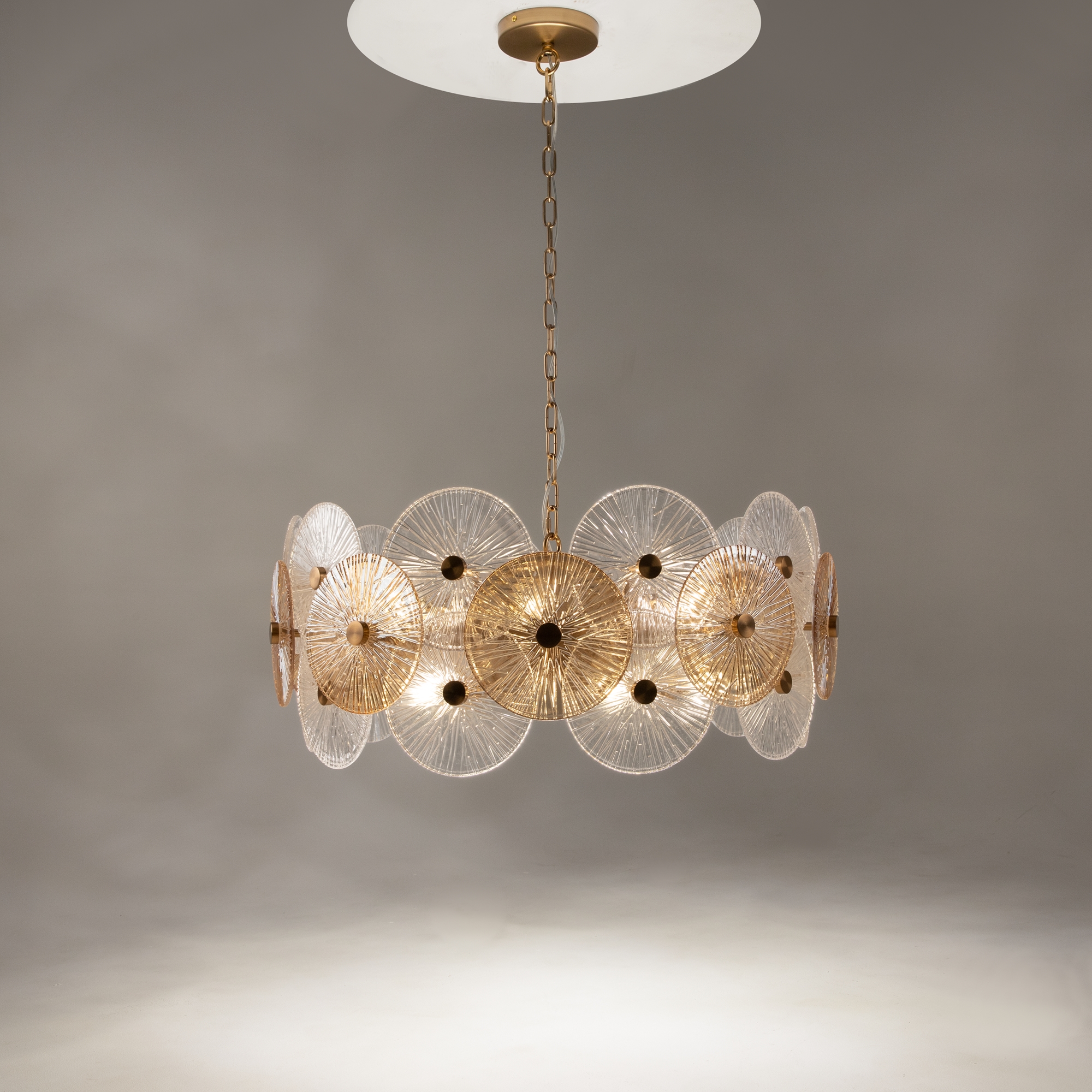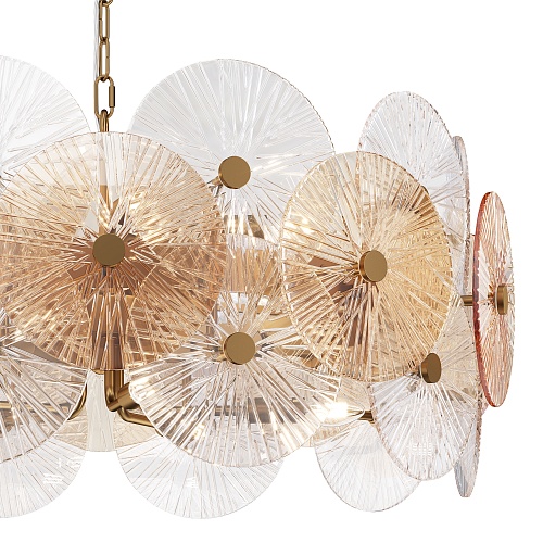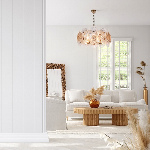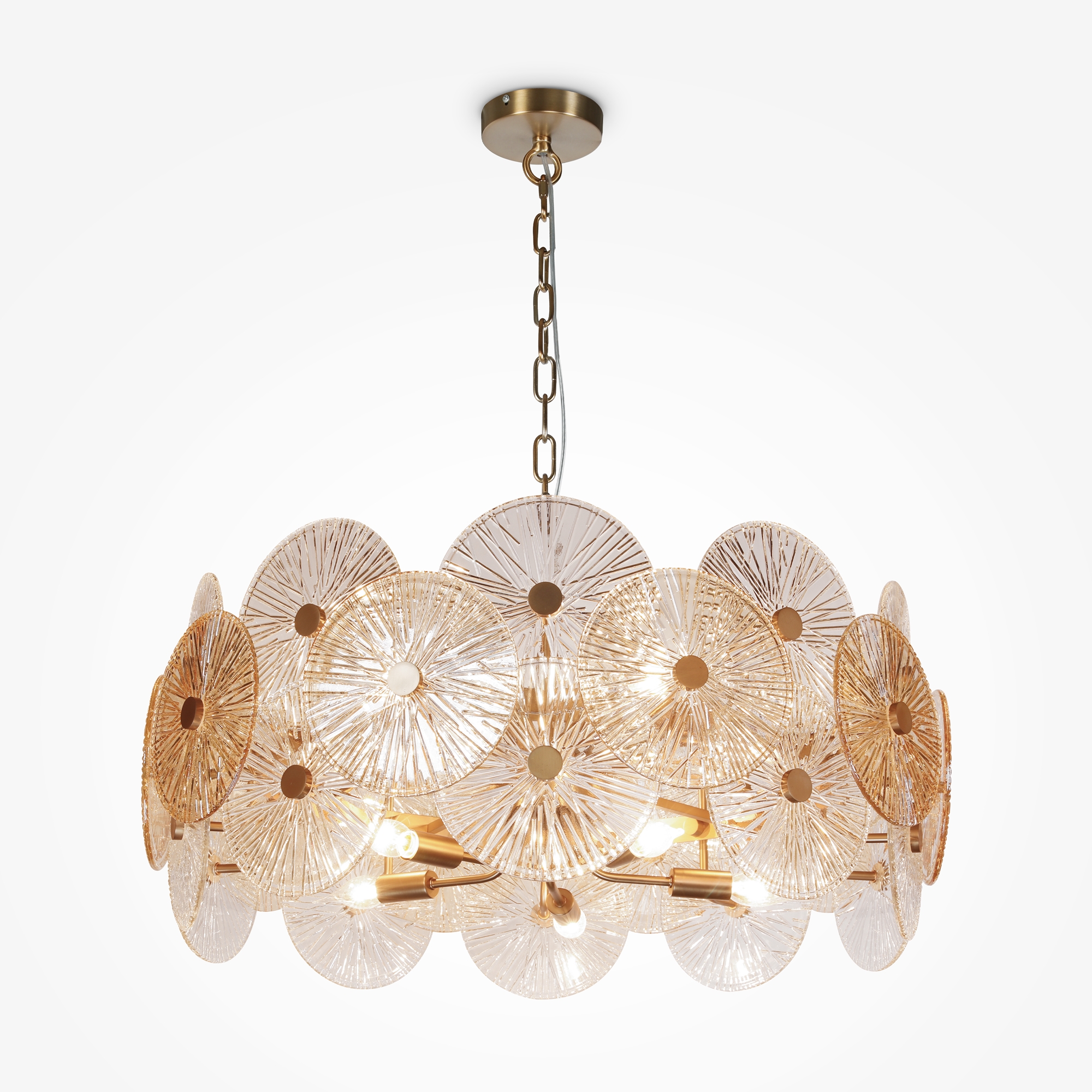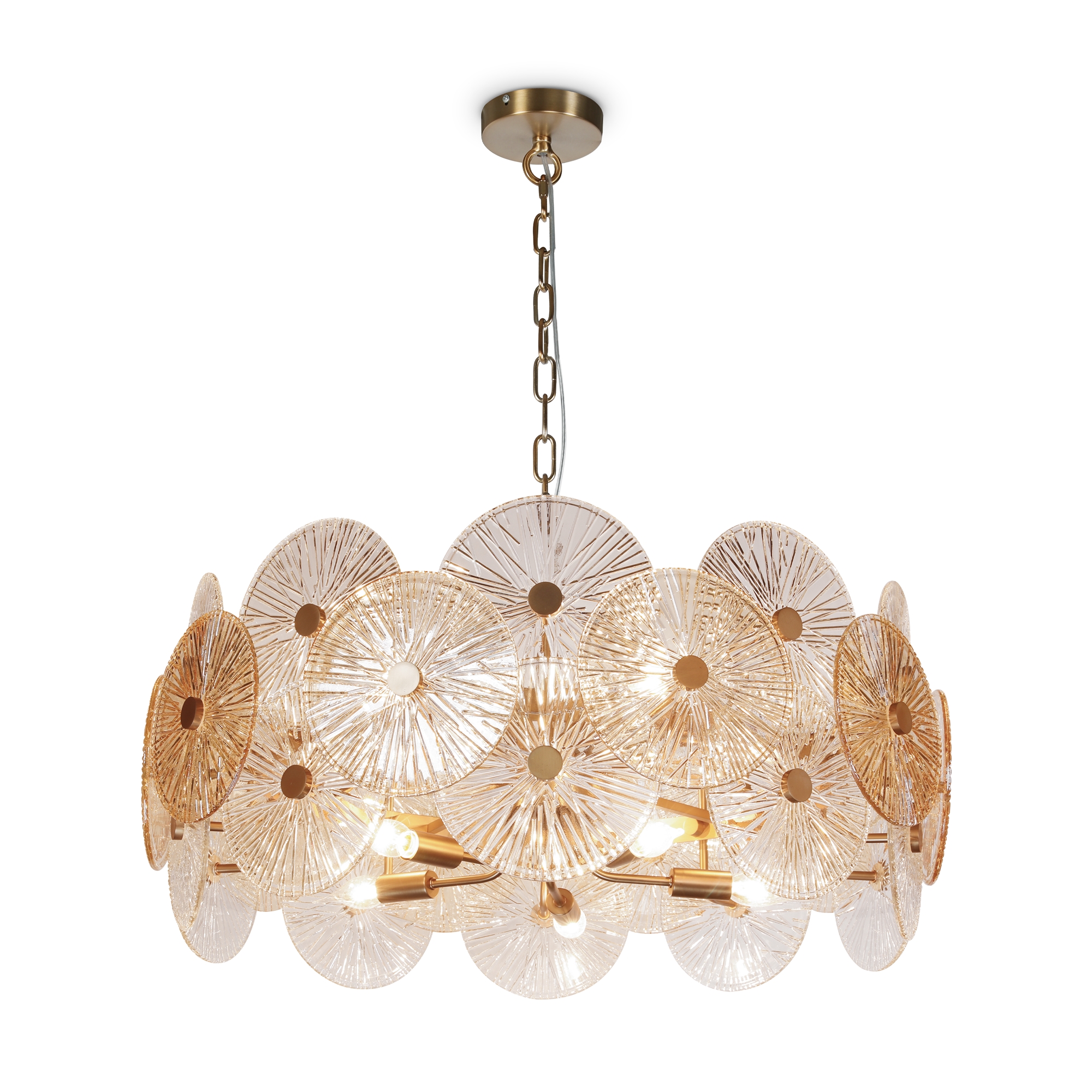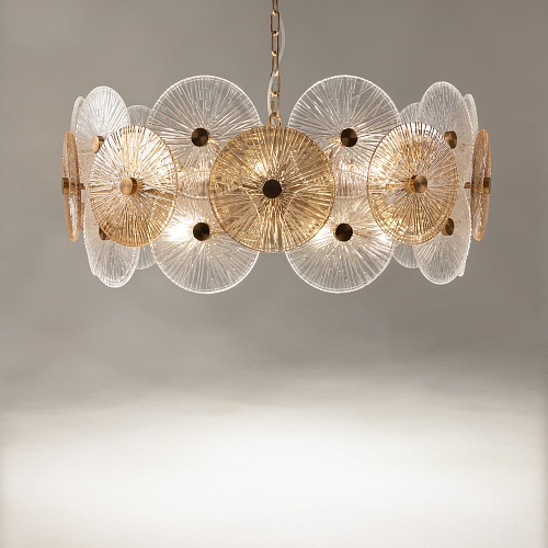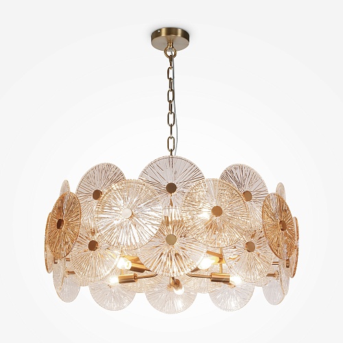 Металлическая арматура в золотом цвете. Сферический декор из штампованного рельефного стекла. Комбинация янтарного и прозрачного оттенка в декоре. Регулируемая высота.