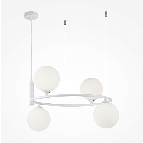 Арматура из металла в трех оттенках: белый, черный, латунь. Плафоны-сферы закреплены на округлом металлическом каркасе. Материал плафонов — выдувное стекло, цвет — белый. Высота подвесных моделей регулируется.