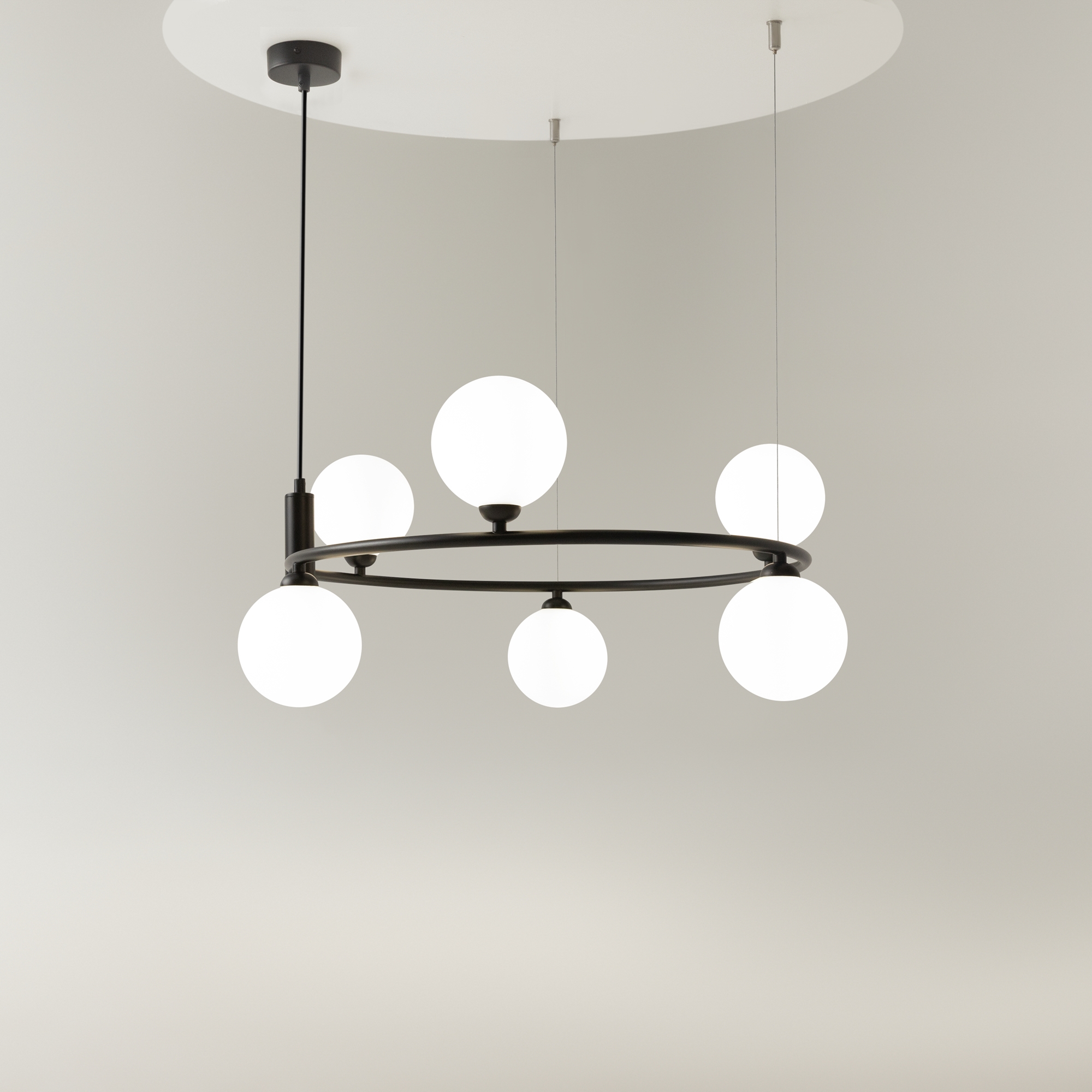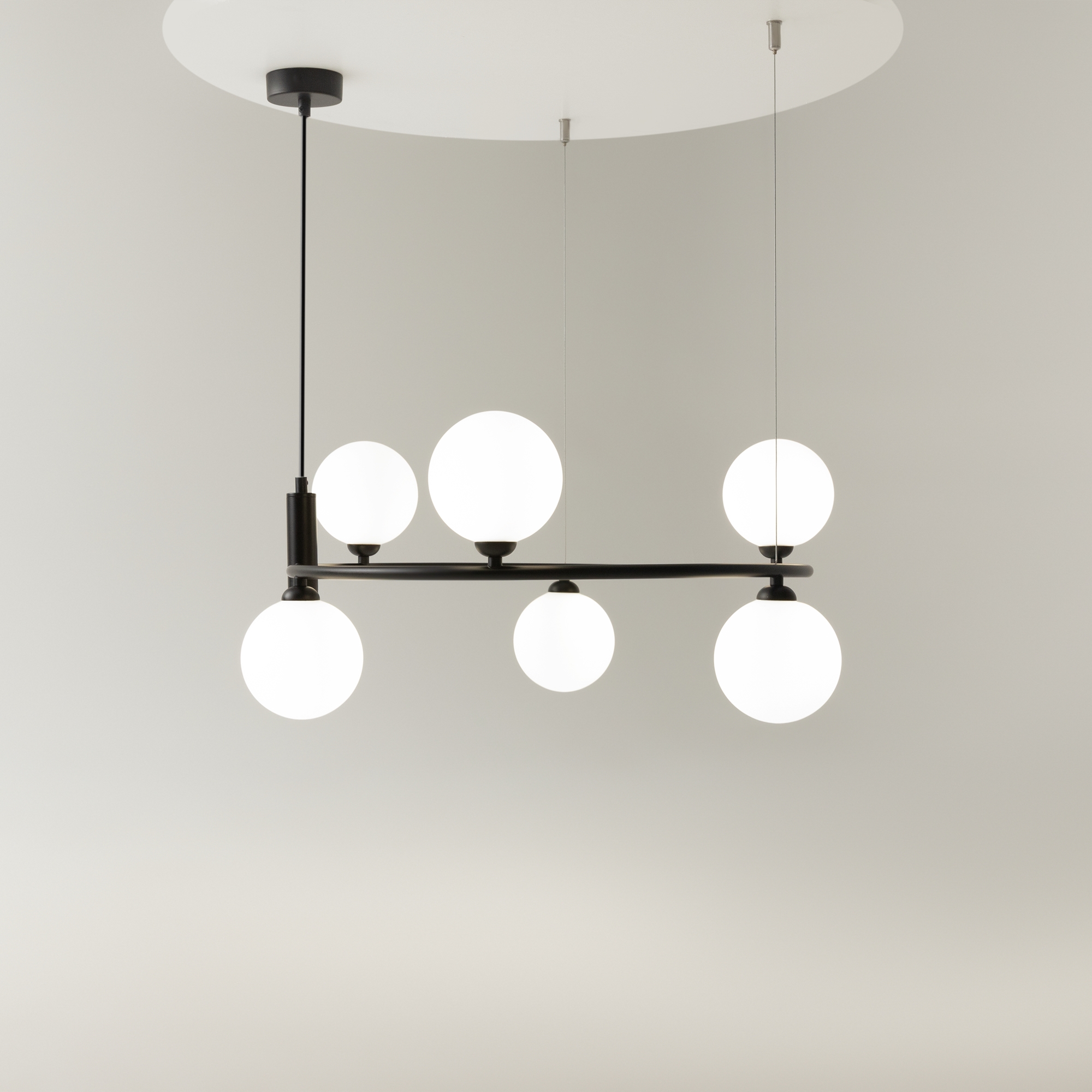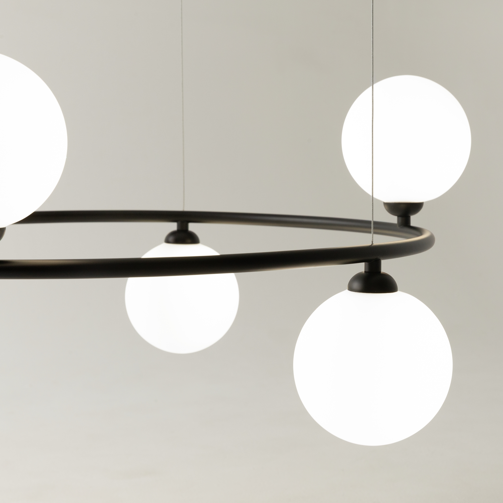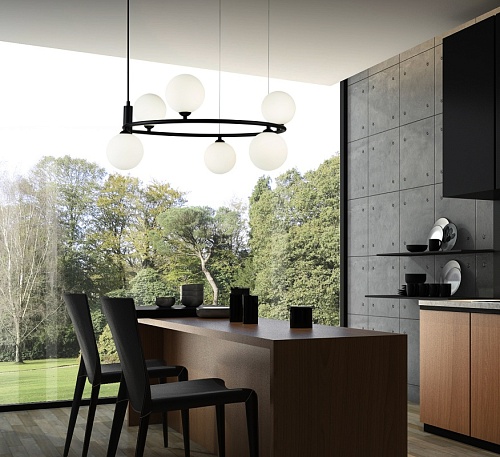 Арматура из металла в трех оттенках: белый, черный, латунь. Плафоны-сферы закреплены на округлом металлическом каркасе. Материал плафонов — выдувное стекло, цвет — белый. Высота подвесных моделей регулируется.