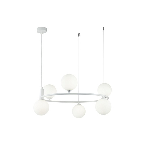 Арматура из металла в трех оттенках: белый, черный, латунь. Плафоны-сферы закреплены на округлом металлическом каркасе. Материал плафонов — выдувное стекло, цвет — белый. Высота подвесных моделей регулируется.