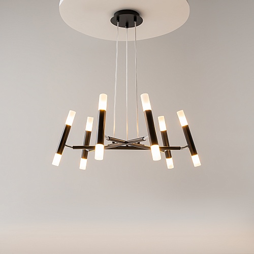 Металлическая арматура в матовом черном цвете. Цилиндрические плафоны вра щаются на 340° по горизонтали и 90° по вертикали. Возможность видоизменять дизайн светильника. Рассеиватель из матового стекла.