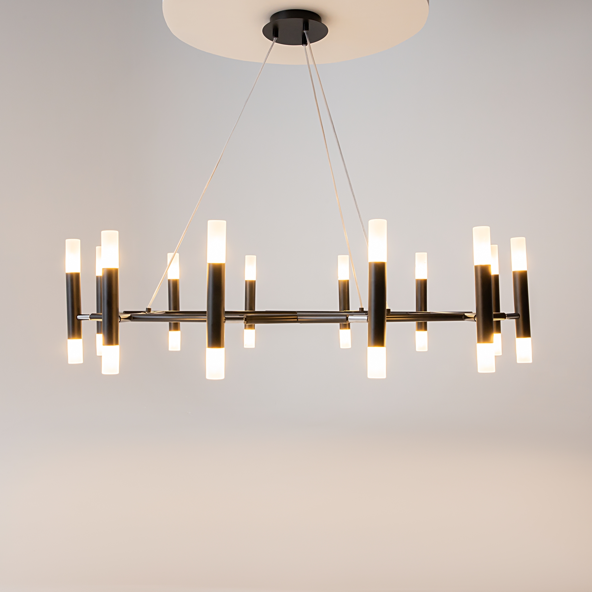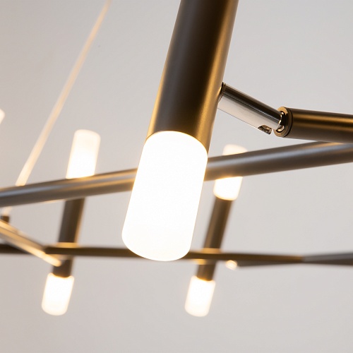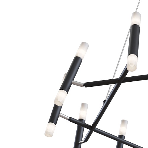 Металлическая арматура в матовом черном цвете. Цилиндрические плафоны вра щаются на 340° по горизонтали и 90° по вертикали. Возможность видоизменять дизайн светильника. Рассеиватель из матового стекла.